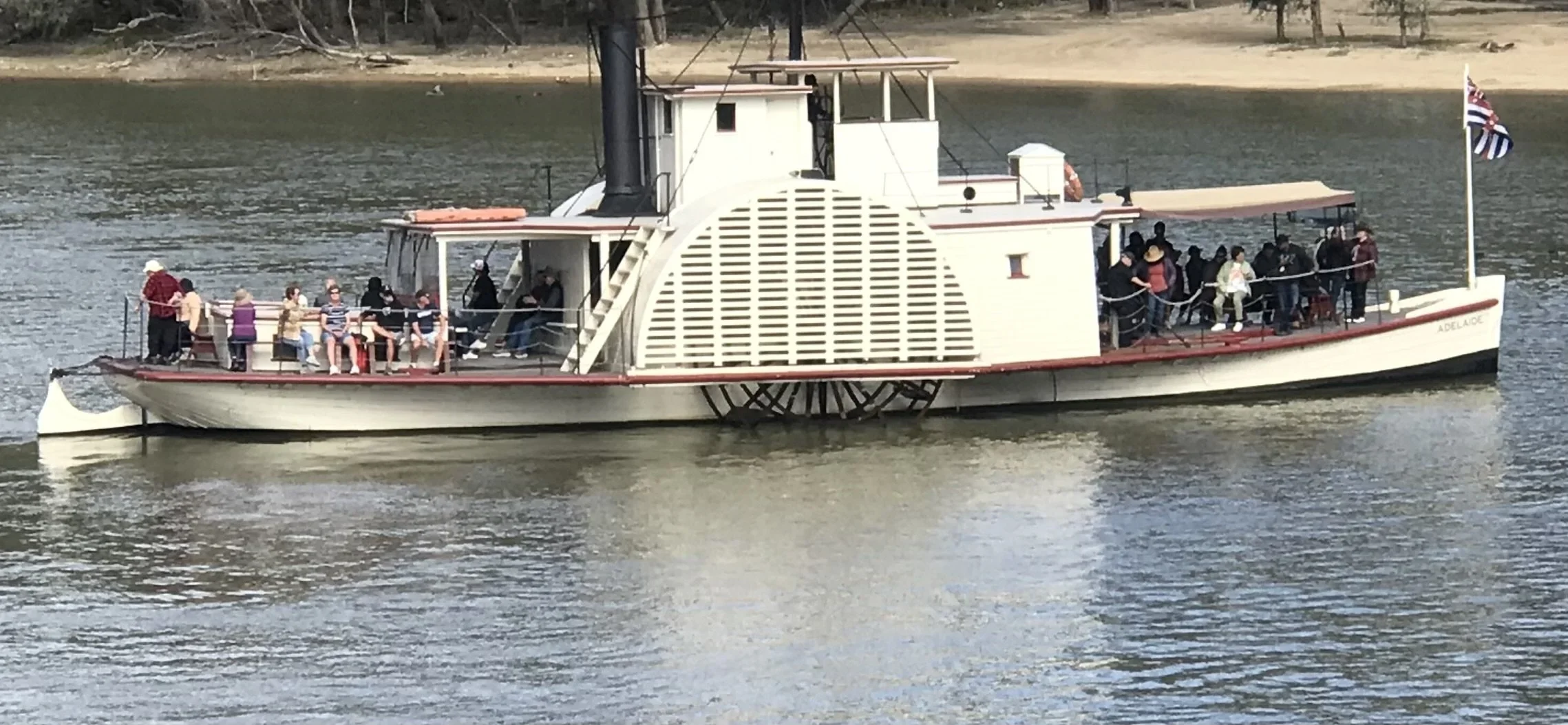 A recent interstate road trip with lifelong friend Martin Bryan, led us to a glide on the Murray river. Aficionados of wooden boats ogle at the age of Echuca’s paddle steamers. We took the PS Adelaide, claimed by the owners to be “the oldest working wooden hulled paddle steamer in the world”. She was built in 1866. This claim deserved research and I will refer to the result below.