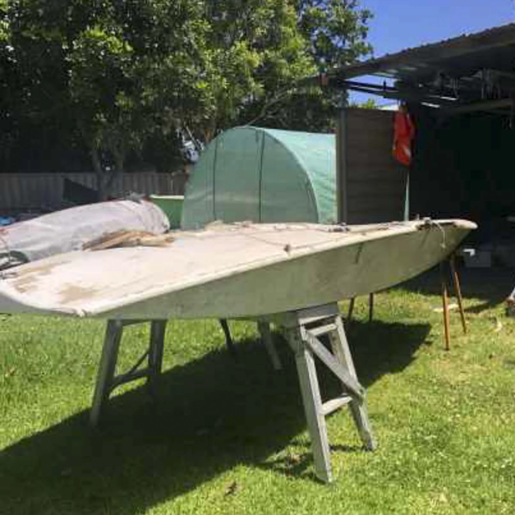 The hull has been restored. Original sail in good condition. New rudder & centreboard. Good timber mast. Needs finishing. Great boat when completed. Basically a 12’ version of a scow moth, but with trapeze instead of wings. hull only requires a finish coat to complete. Whose game to sail it?