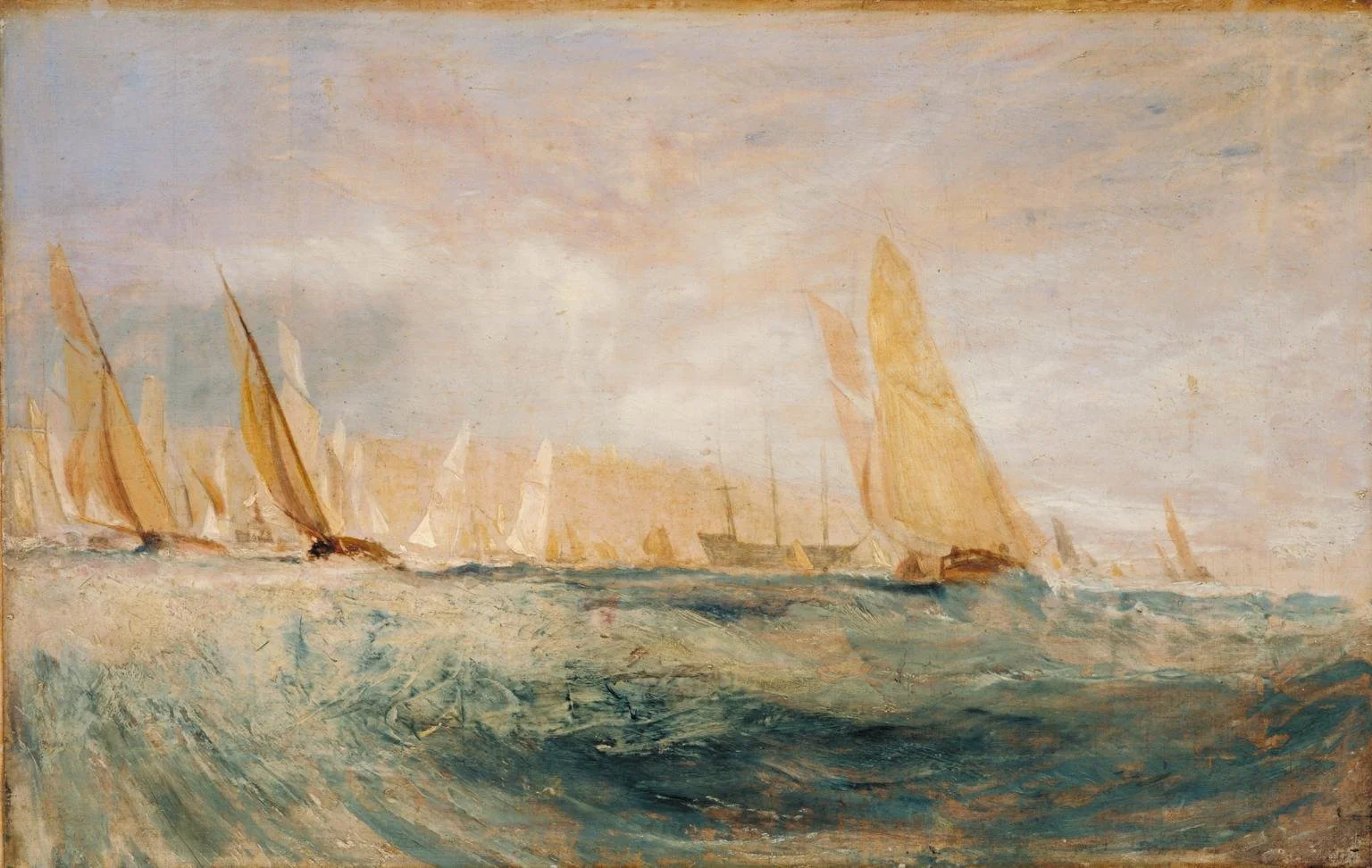 This 1827 sketch East Cowes Castle, the Regatta Beating to Windward was possibly made on board a ship moored in the Solent. This was only the second Cowes Regatta. The yacht race is still an annual event today. It is one of several oil sketches of the same subject for a painting commissioned by architect John Nash. Turner stayed with Nash at his self-designed East Cowes Castle on the Isle of Wight. Since demolished, it gleams here on the distant hill.