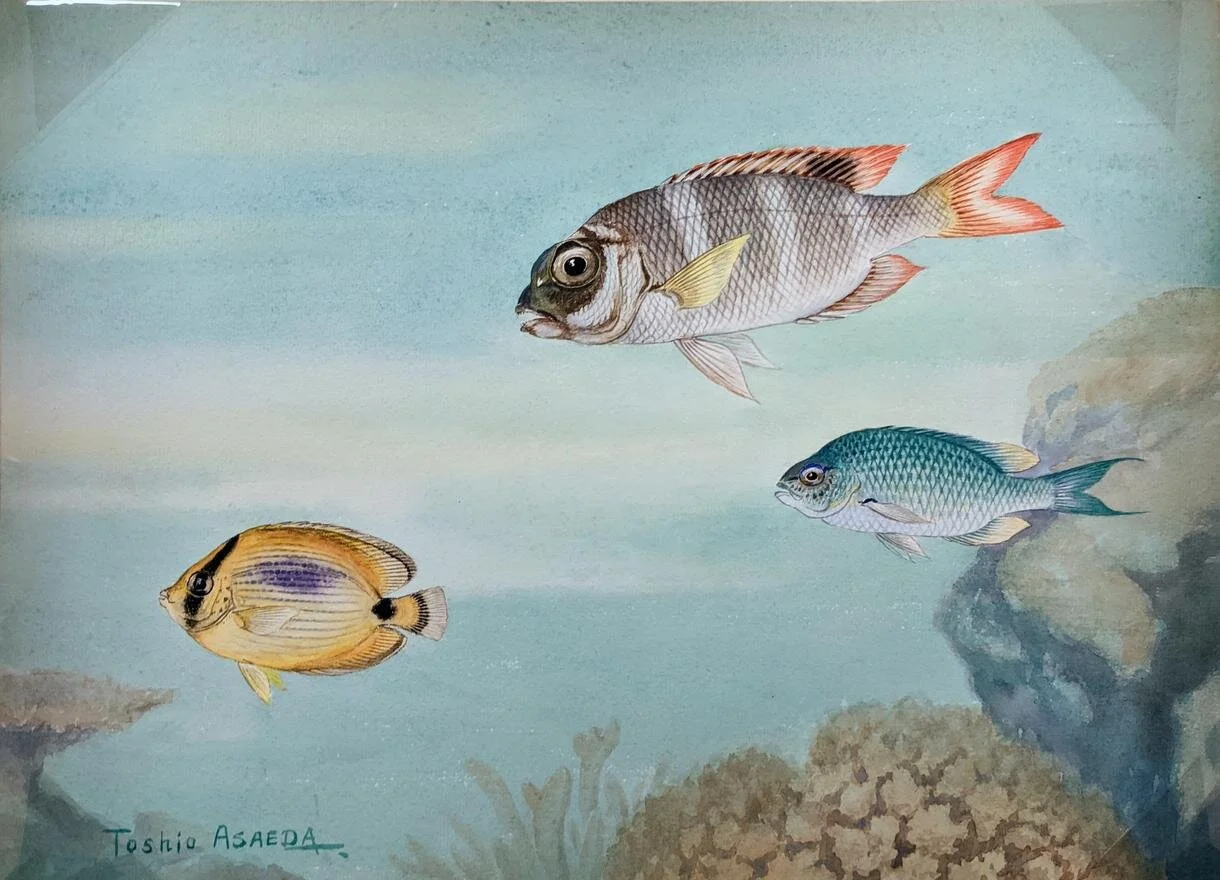 Toshio Asaeda accompanied Crocker on all the trips from 1932. Asaeda was a trained photographer, filmmaker, artist and taxidermist. He made plein-air landscape paintings and detailed water-colours of the fish and crustacea specimens. Before Kodak and Agfa made colour film and photography a stable process, Asaeda’s coral reef fish are truly wonderful scientific documents. The sketches were made when specimens were just pulled from the water to capture the natural colours and transparency, before fading in formalin filled jars.