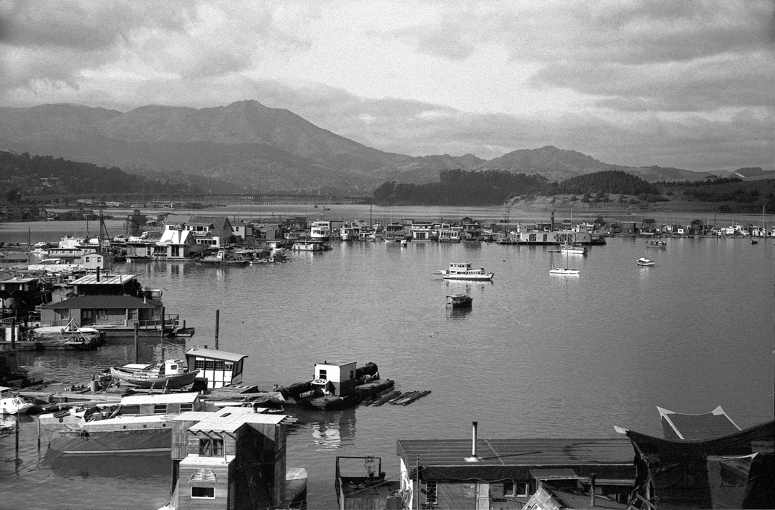 In the 1970s, the floating community of Sausalito’s Richardson Bay, set against the backdrop of Mount Tamalpais, was primarily home to bohemians whose modest dwellings had been constructed from salvaged materials. Photo copyright Walter Van Voorheers/Sausalito Art Source