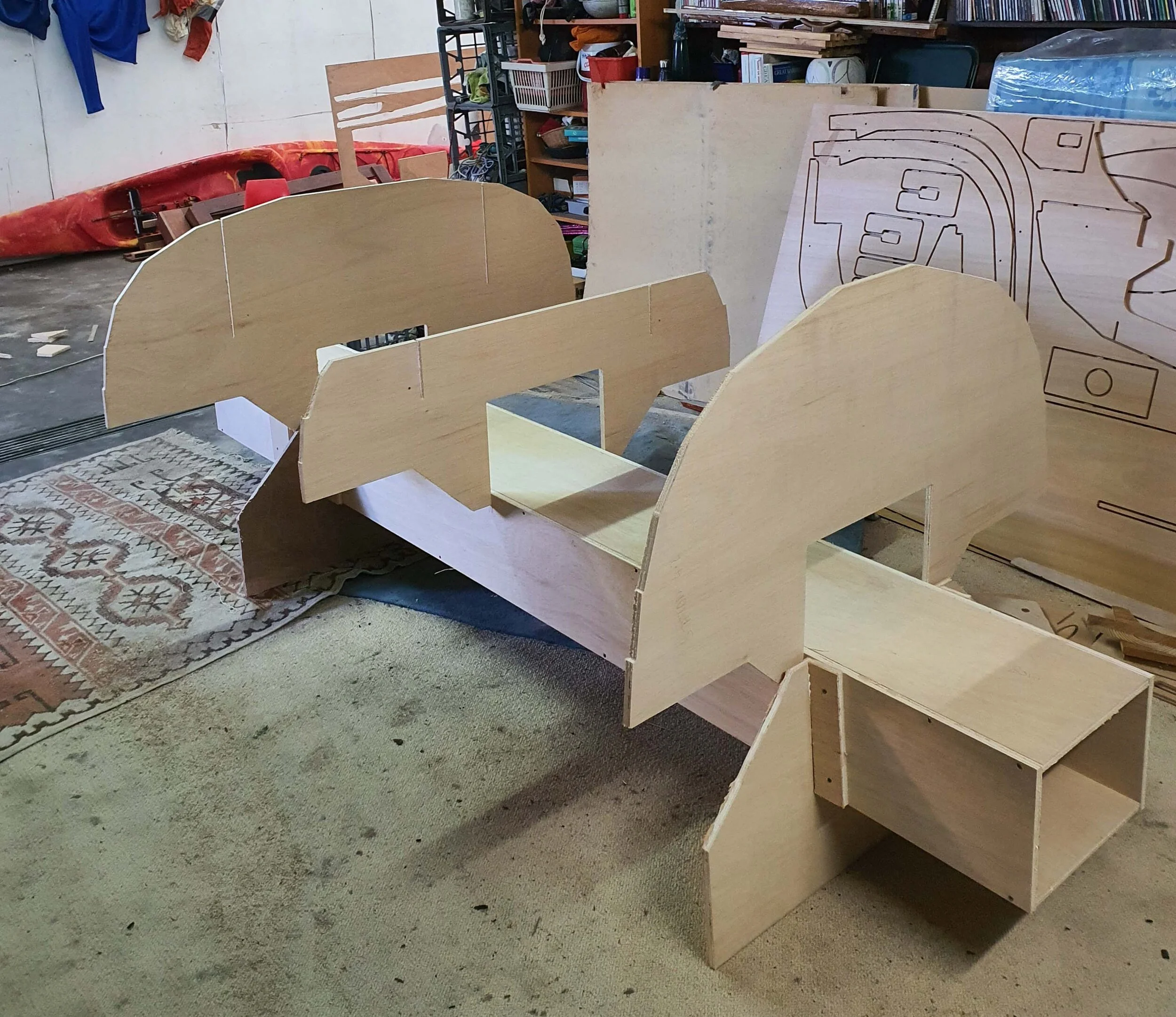 The building frame is supplied as part of the CNC kit. The final boat will be accurate, as in symmetrical and straight, only to the extent you have taken care to measure and assemble this frame accurately. A trap here is that the plan measures the position of each frame on the strongbox from a reference of the previous frame, sometimes from the front face and sometimes the back. It is imperative the bulkheads and frames as shown in the picture are exact and square.