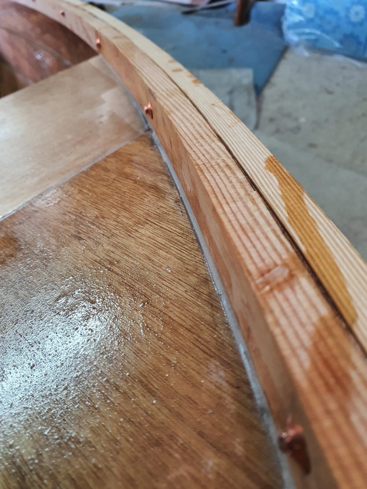 To hide the fact this is a plywood epoxy and not a genuine timber boat, I used copper nails and rivets on the gunwales.