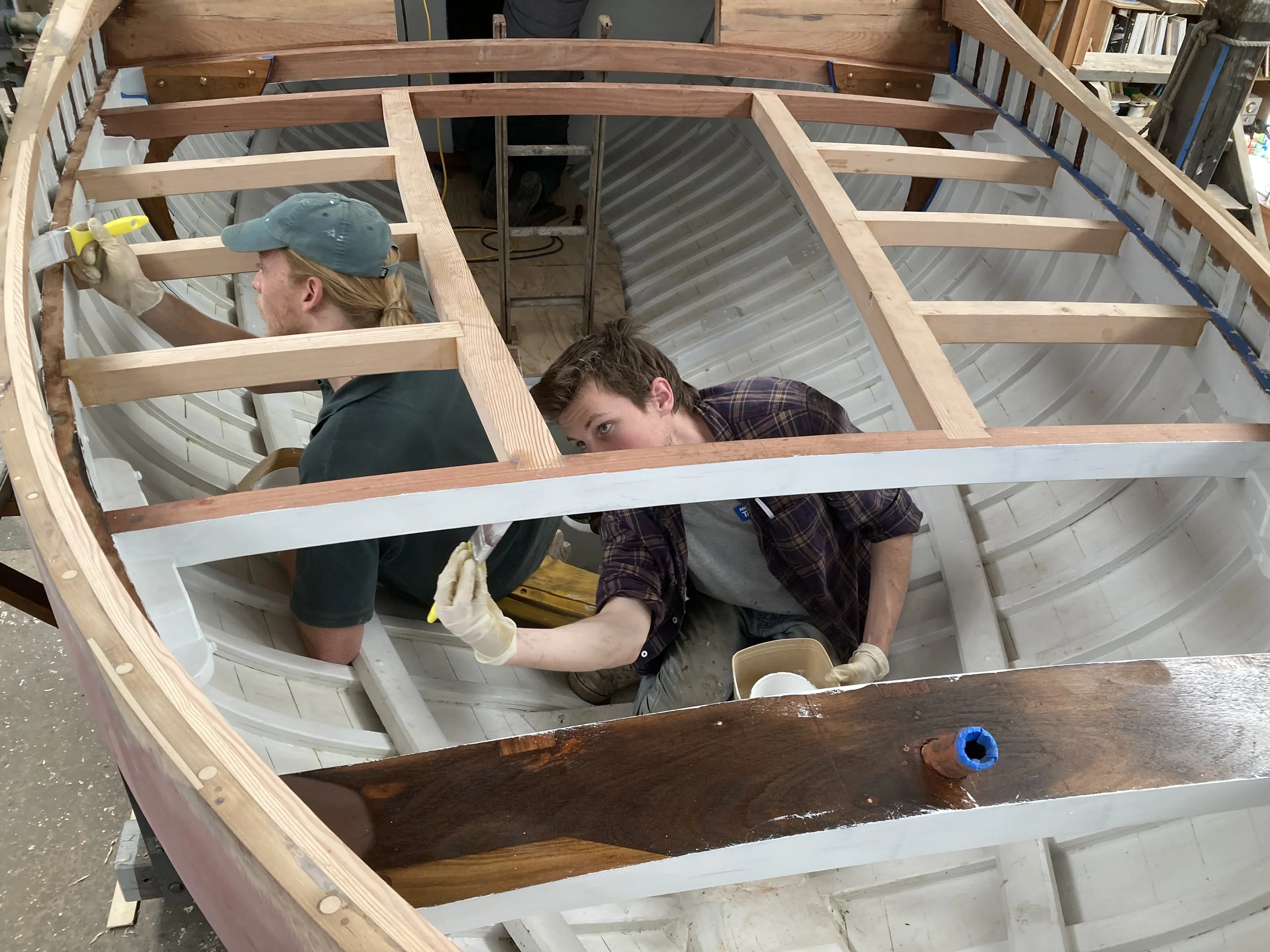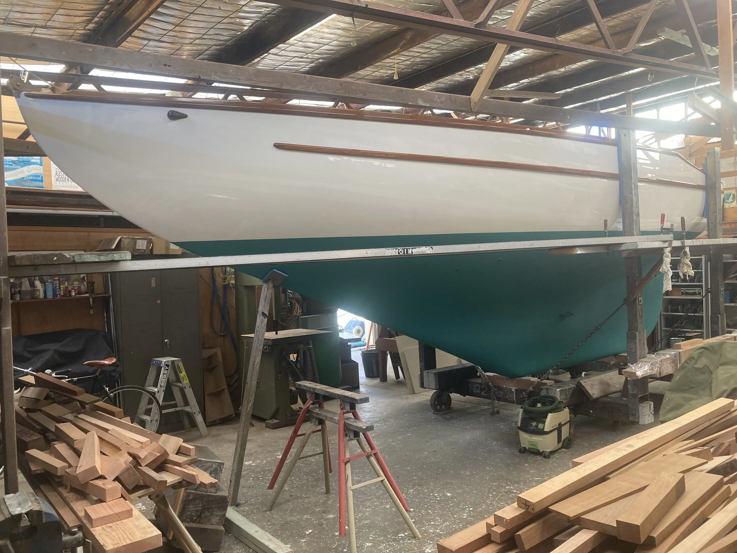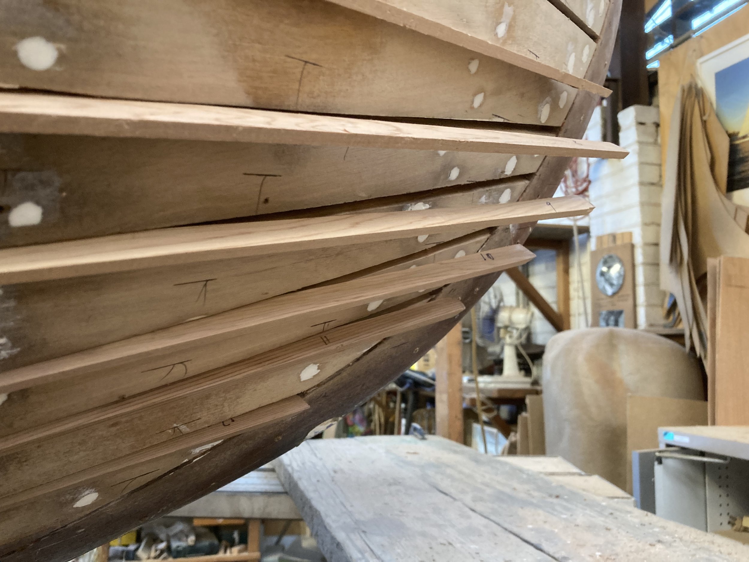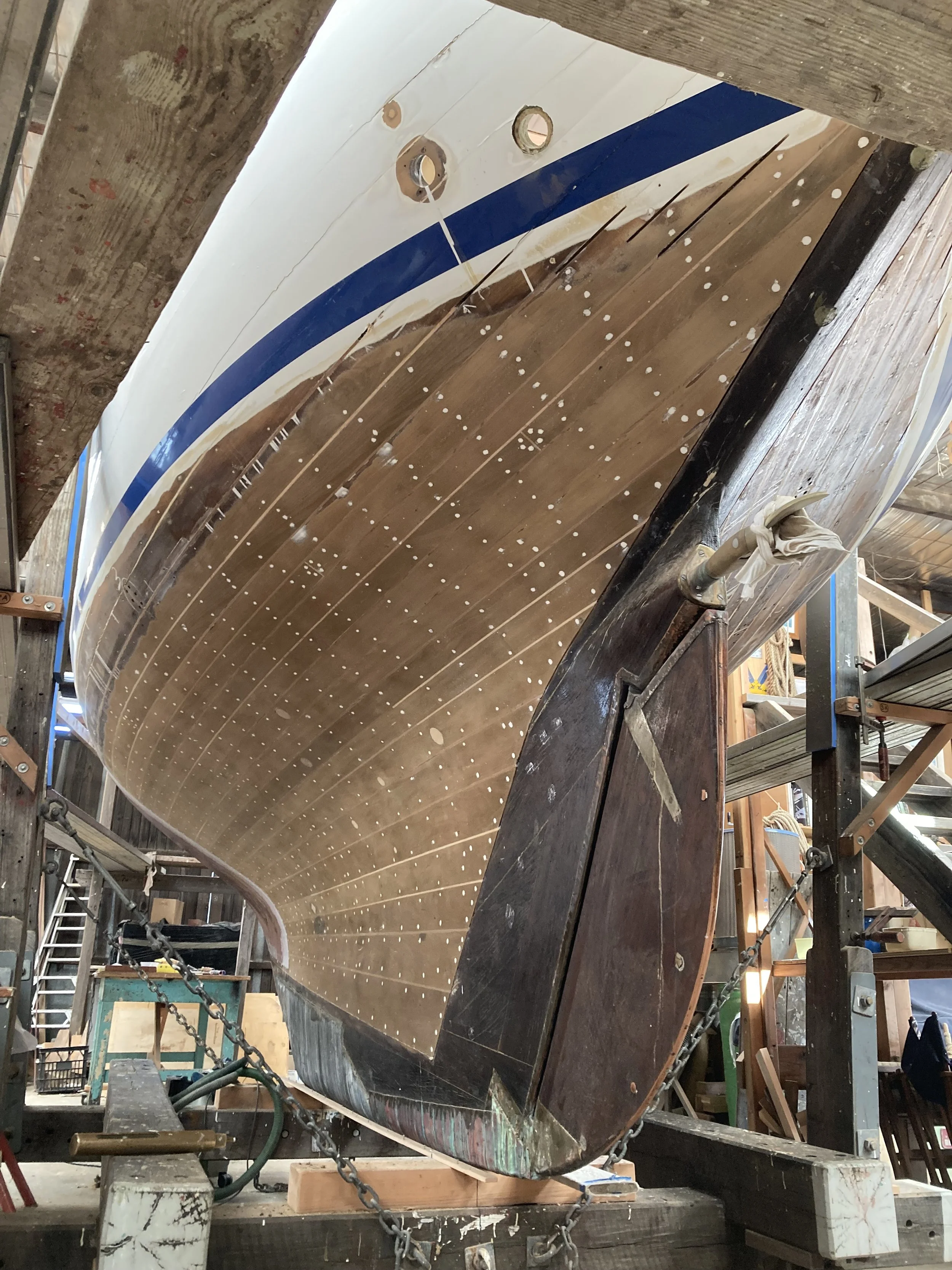 All the frames have been repaired, where necessary and the boat refastened as needed. All butt blocks have been replaced and refastened and the keel has been re-bedded with the keel bolts all checked. Once all the structural work was completed every seam had the original corking and putty removed, each seam then being filled with wedge shaped red cedar, glued into place to make an extremely strong hull even stronger - effectively becoming a monocoque construction. This was then sheathed with bi-axial fibreglass adding further strength and integrity to water ingress resistance.