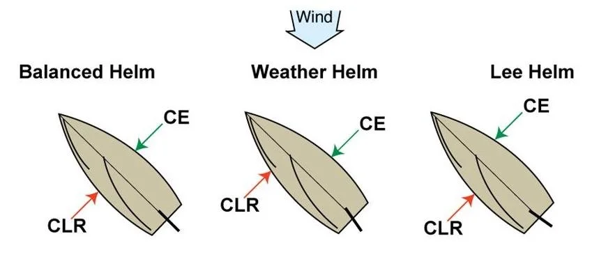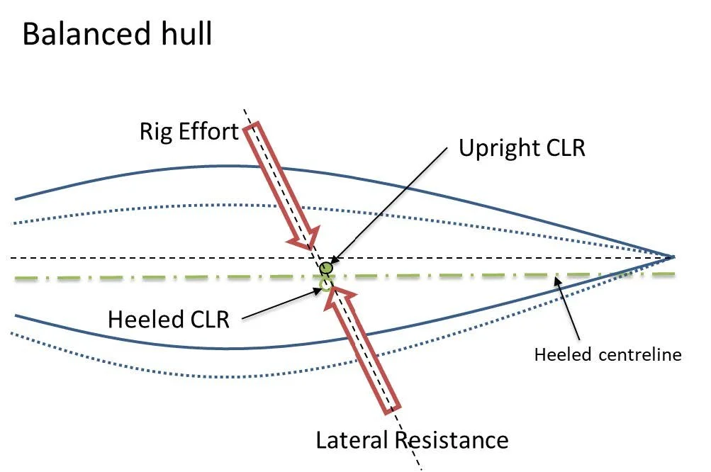 In a well-balanced hull, CE and CLR remain aligned as the boat heels.