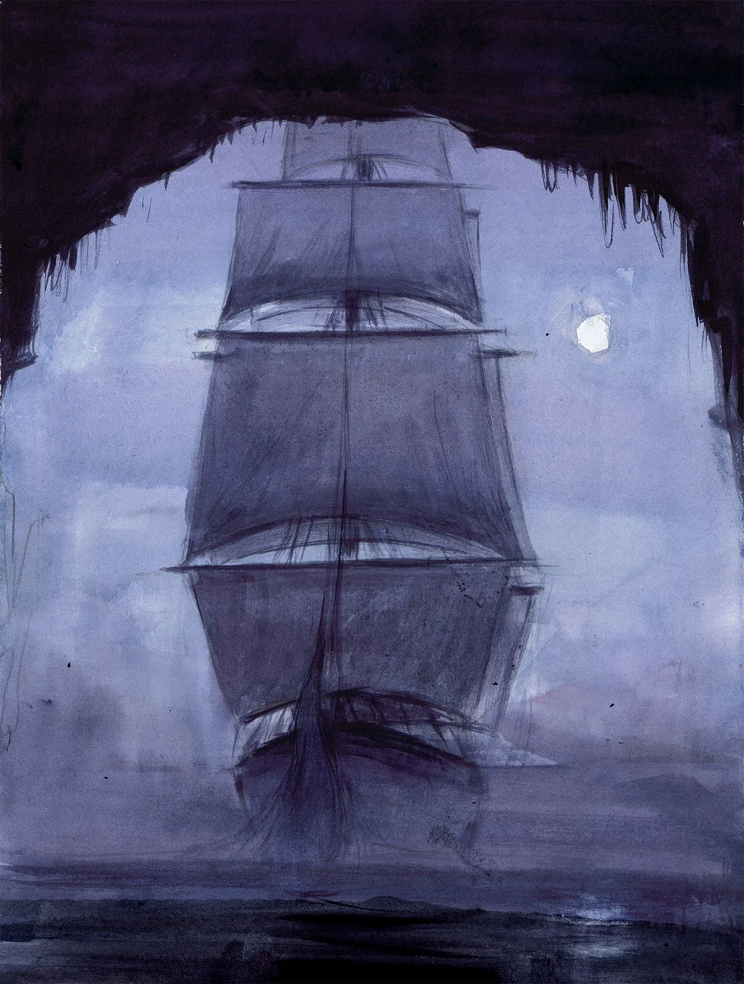A horrible crunch was heard out of the darkness as the bowsprit’s jib-boom extension snapped off against a protruding crag. GENERAL GRANT recoiled, slowly turning 180° until her stern crashed into the cliff, an impact that mortally damaged the rudder and broke the ribs of the helmsman. Rudderless, drifting, she again recoiled and slowly swung around to where the cliff-face opened into what one survivor called “the horrible cavern.” GENERAL GRANT was slowly drawn, bow-first, into an enormous sea-cave so large the mighty ship was swallowed whole. It was almost unbelievable. She paused momentarily as a topgallant snapped off on the cathedral-like entrance, then was washed relentlessly into utter darkness. As topgallants and spars scraped the roof and walls, they snapped and crashed to the deck along with rigging, chunks of earth, and rocks.