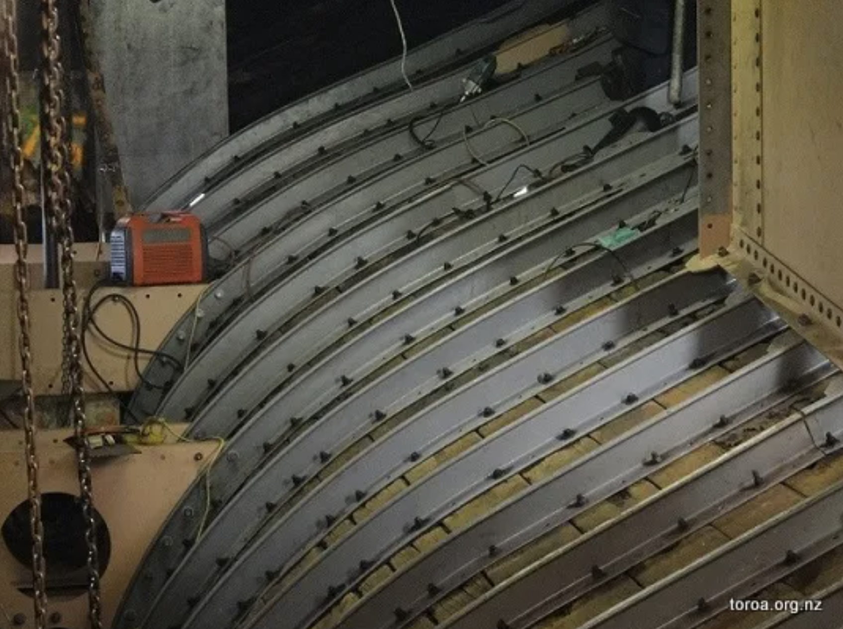 All 71 bulb-angle frames, each about 12 m long gunwale to gunwale, have been fabricated and installed to date, together with floors and reverse frames, intercostals and longitudinals. And some 200 sq m of steel bulkheads of plate and angle fastened with several thousand rivets. The main-deck beams have all been replaced. TOROA’s large triple-expansion steam engine has been repaired, de-rusted, painted and reassembled, and is nearly ready to be lifted back into the hull when that is ready. An auxiliary steam