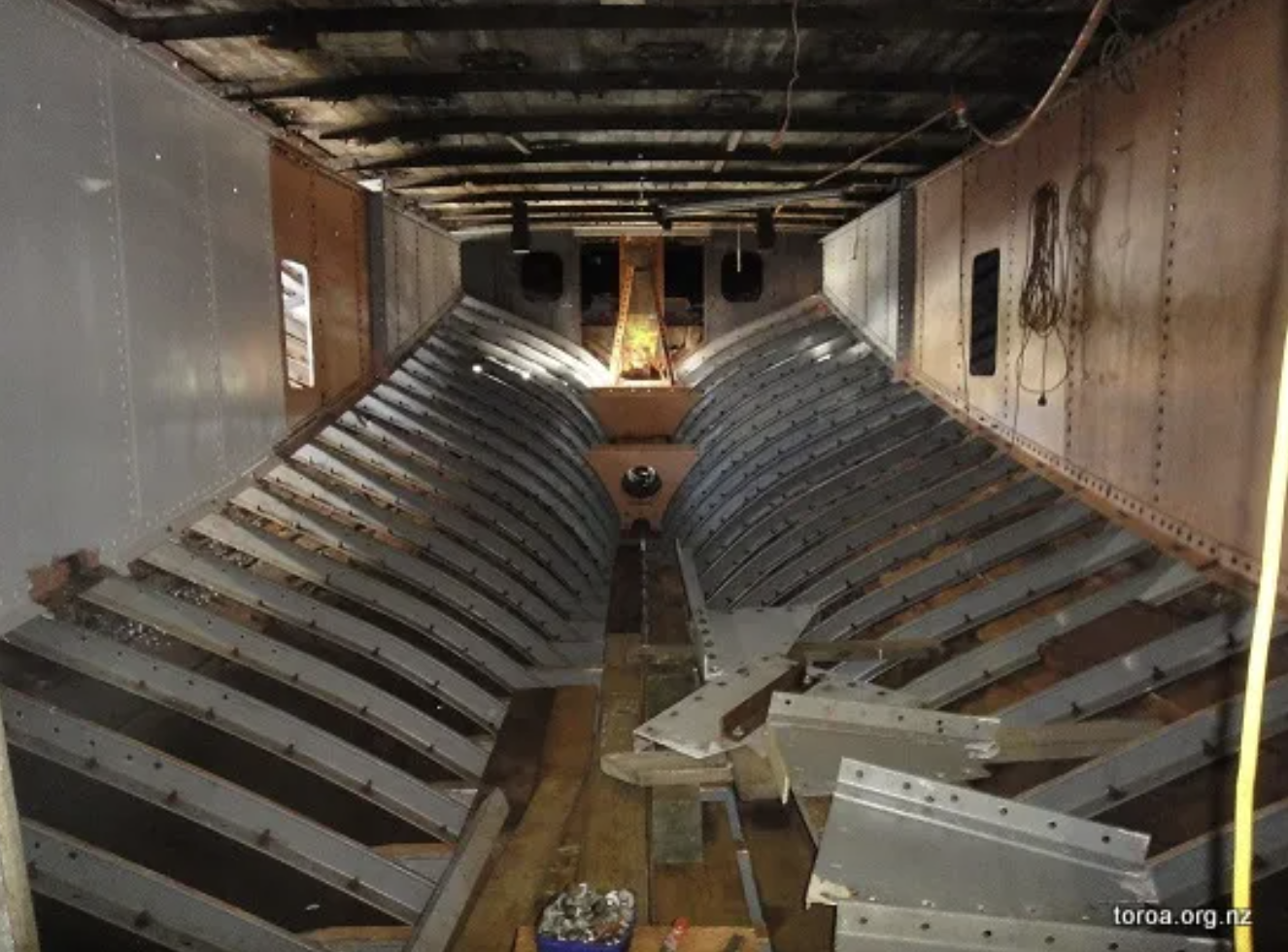 Renewed steelwork in TOROA’s hull aft of the engine room. New steel bulb-angle frames (ribs) have been bent to shape and bevel while heated to above red heat. Bulkheads have been hot-riveted with 16 & 20 mm diameter mild steel rivets. The steel deck beams in this area had yet to be tackled when the photograph was taken.