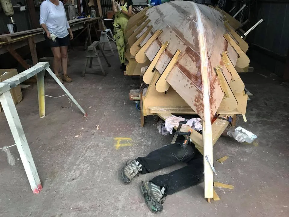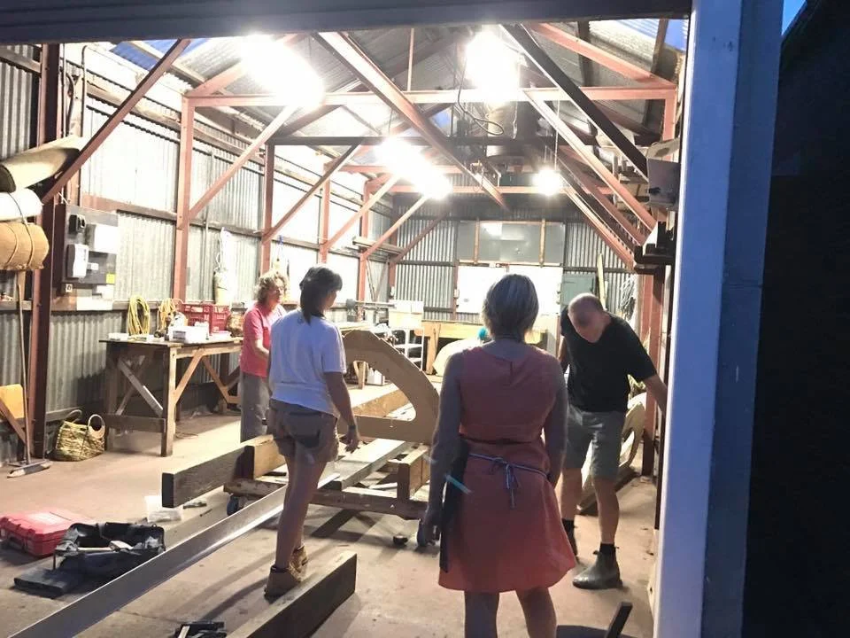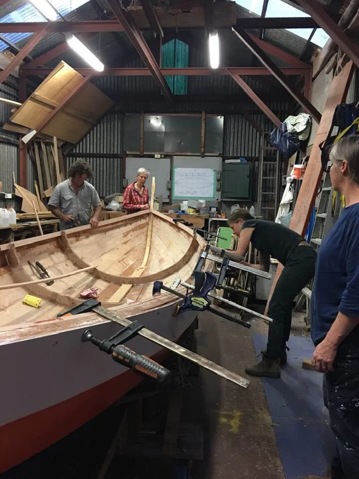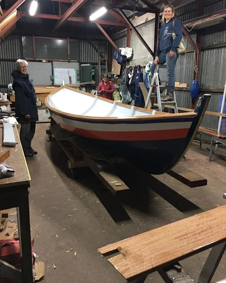 The St Ayles has spawned a worldwide community of amateur boatbuilders and rowers. Here in Williamstown a group of local women, the WillySkiffies, ordered a kit in 2017. With guidance from Ferdi and Wendy Darley, they learnt boatbuilding and sea-woman-ship skills along the way. This is exactly what Iain had in mind for his lapstrake ply technique. THURSDAY was launched in November 2019 with much fanfare and a Scottish Pipe Band. She’s doing a raid on the Gippsland Lakes this weekend. The Skiffies are rowing the 110km from Sale to the Paynesville Classic Boat Rally.