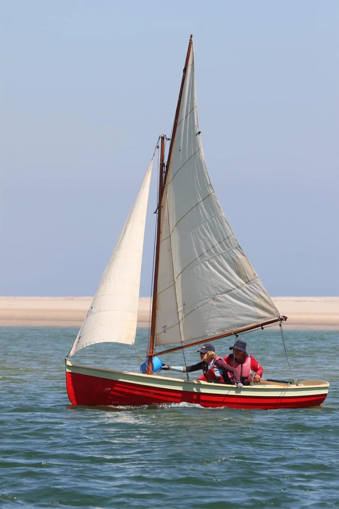 The Oughtred Boats catalogue is worth exploring. The vessels he designed and drew were of Scottish and Norwegian working boat descent and well known for being beautifully proportioned. His popular boats include the Caledonia Yawl, Ness Yawl, Grebe, Tammie Norrie, Shearwater, Arctic Tern and the Acorn skiff. Several were on the beach at the Inverloch Classic Dinghy Regatta a few weeks ago. Iain’s boats will be sailing again at the Geelong Wooden Boat Festival in March including a 17ft Dory skiff with its wee balanced lug sail. The little red Tammie Norrie below is FIVE BELLS. Michael Golding has done many miles with her around Port Phillip and the Gippsland Lakes. Here Michael sails with Tricia O’Brien who is normally skippering her Couta boat LUCY C31.