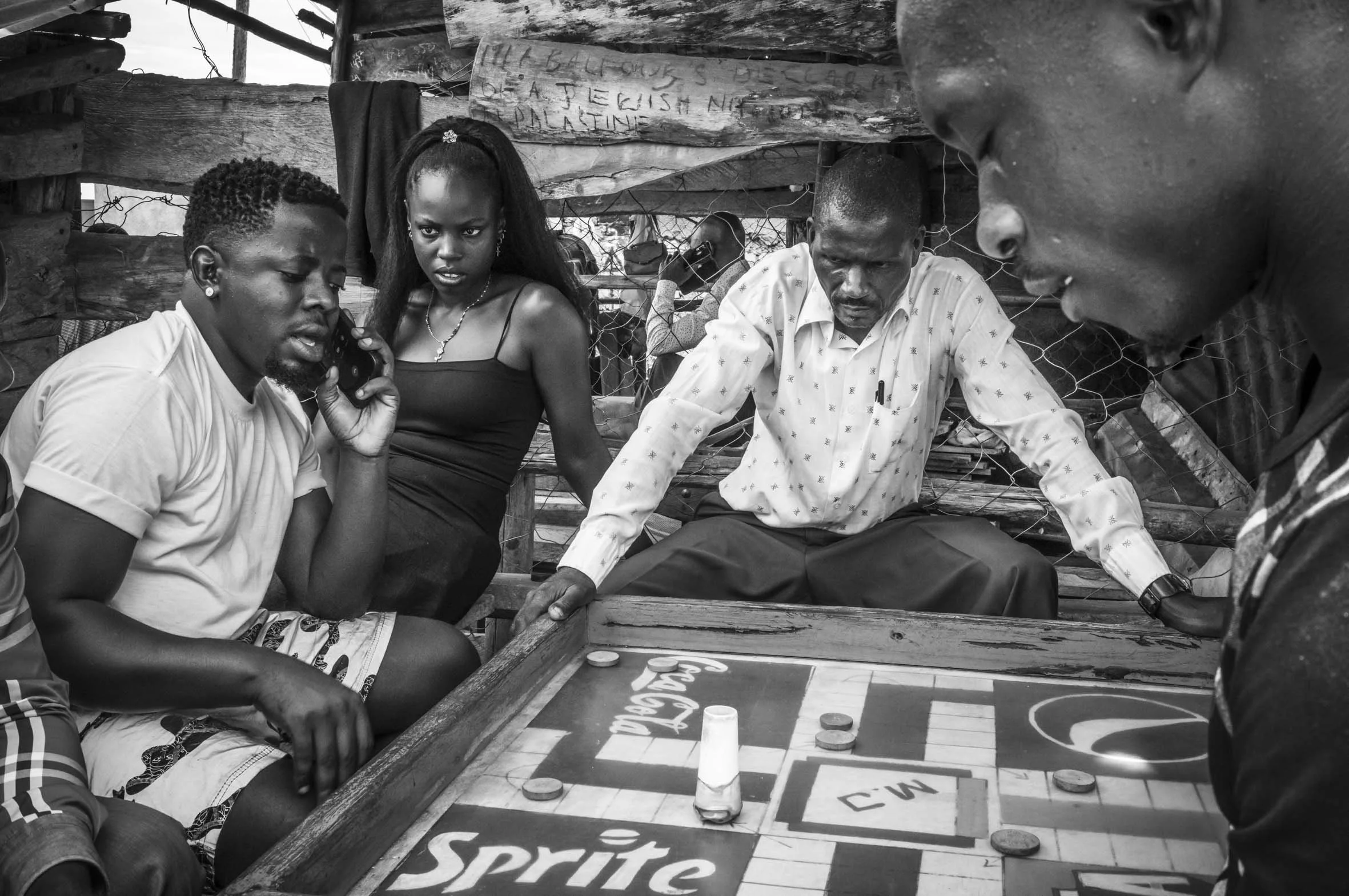 Fisherman play Ludo, a Ugandan obsession while waiting for the evening net laying. The plank in the background has this written on it. "1917 Balfour's declaration of a Jewish Nation of Palestine"