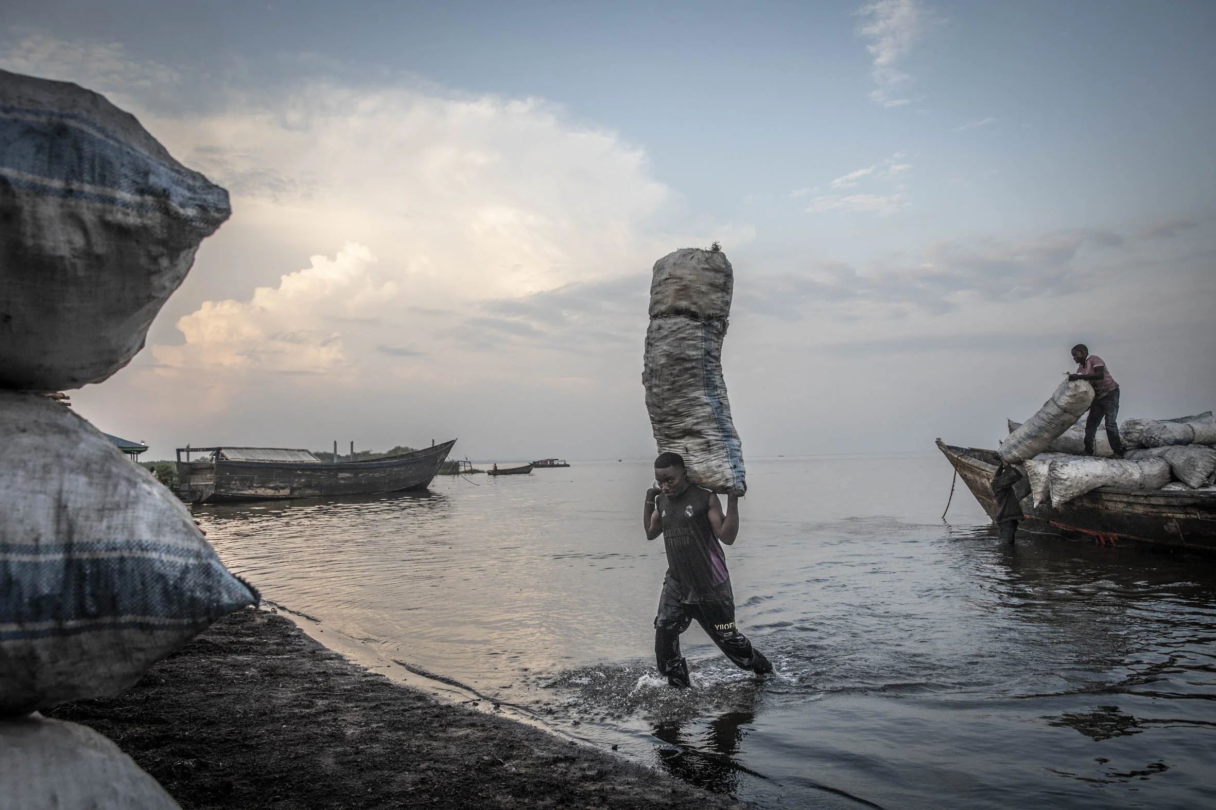 The larger boats, at around 50ft ,are used for transporting charcoal bananas and other agricultural produce. Loading and unloading is done by hand, wading through the shallows.