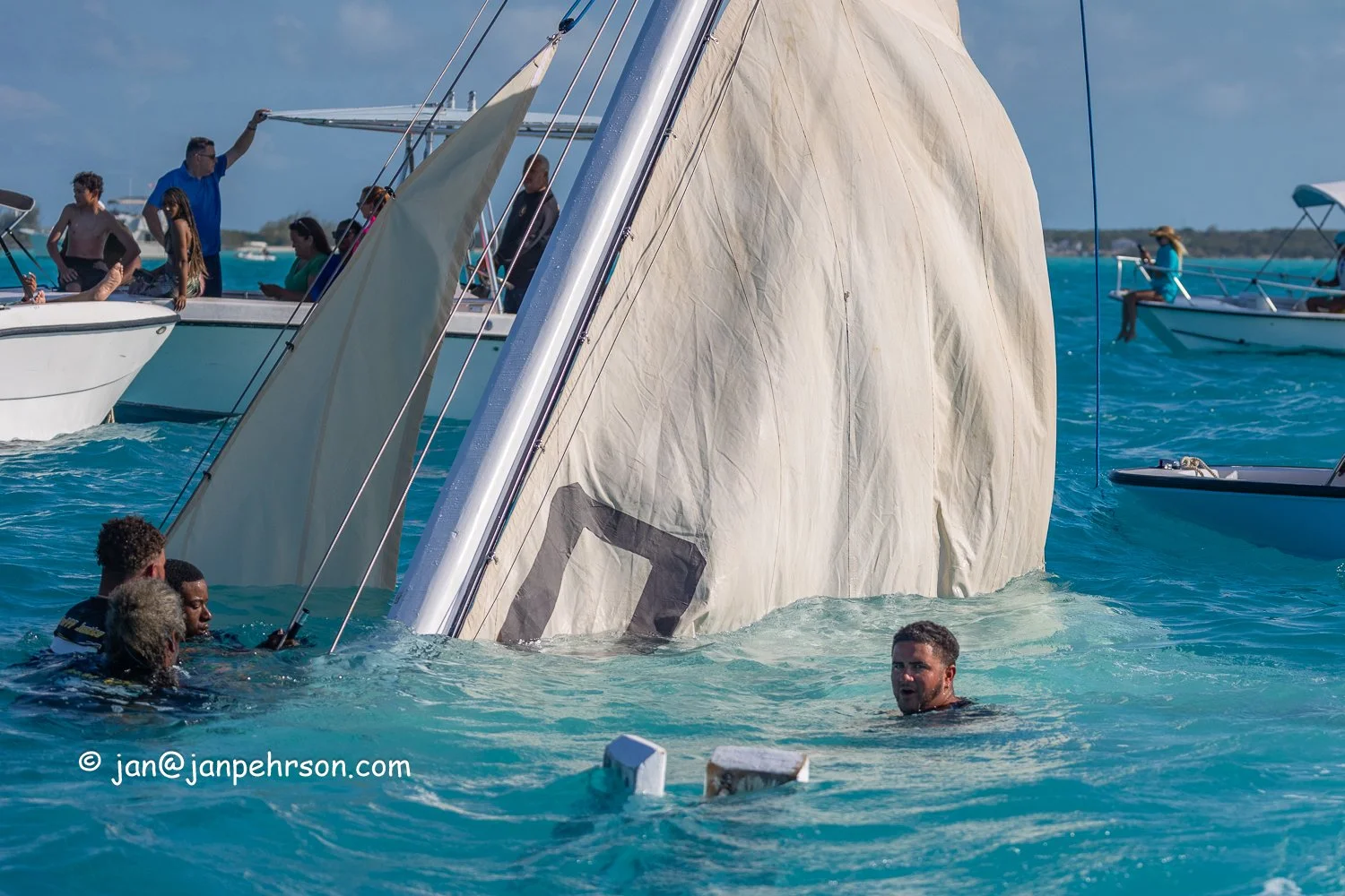 Most dramatically, the mainsheet block on A-Class sloop Rufff Justice jams and the crew cannot not ease the sheet. This causes the sloop, with a displacement equal to a medium sized delivery truck, to heel over and sink in 10 or 20 feet of water. Bahamian sloop sailors have grown up on and in the water, and sailing and swimming come naturally to them. There were no injuries, and Rufff Justice was refloated with no further damage.