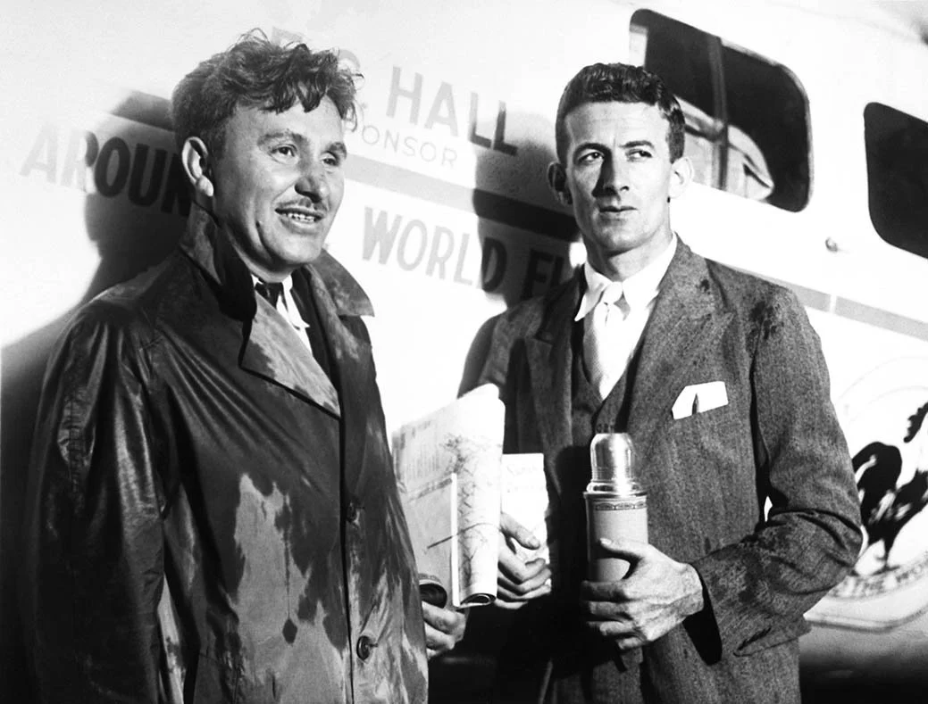 U156797ACME – the original caption on 23 June 1931 read “Roosevelt Field, N.Y., Harold Gatty and Wiley Post, the two adventurous aviators who intend to circle the globe in ten days, took off on the first hop of their journey from Roosevelt Field, N.Y., to Harbour Grace, Newfoundland in the mist.” Photo: © Bettmann/CORBIS.