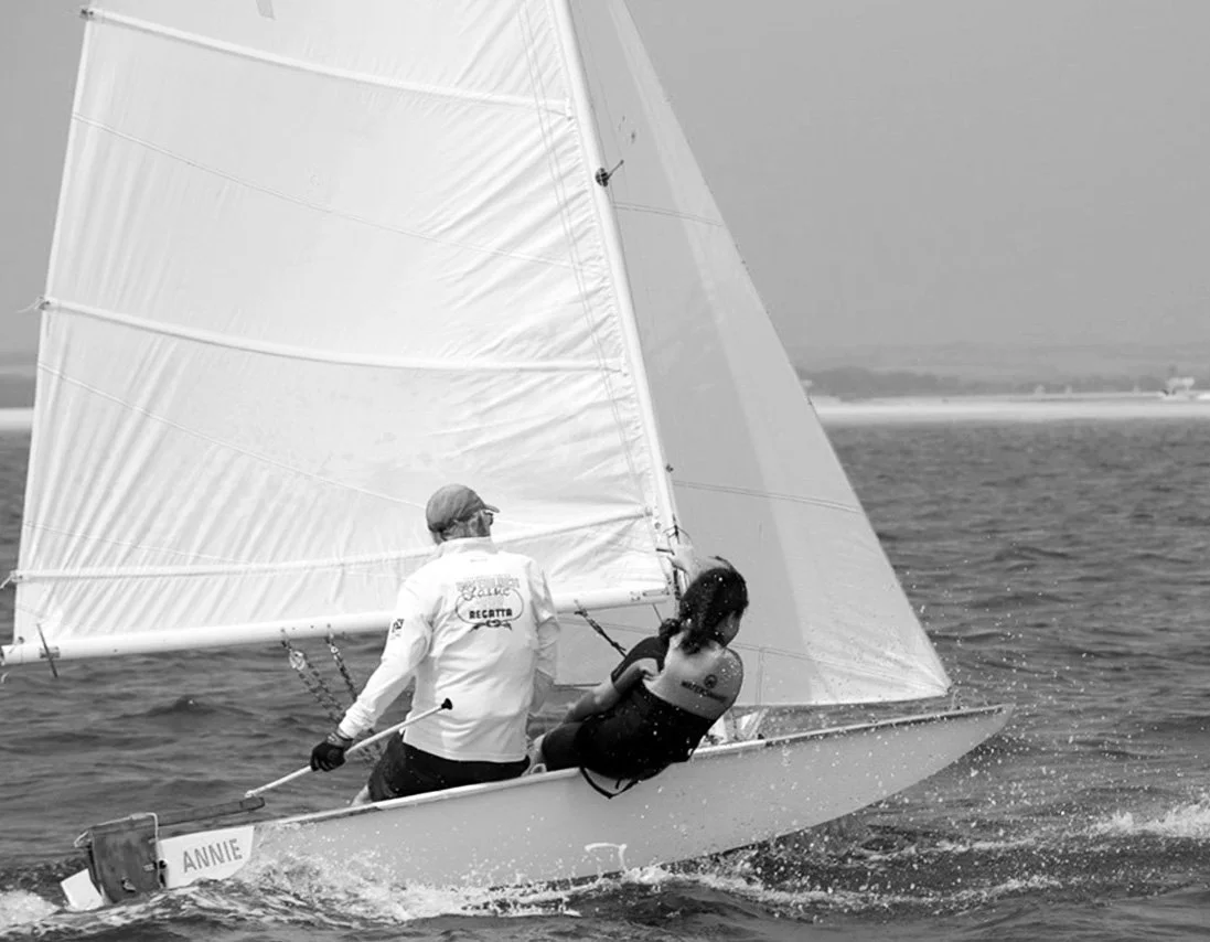 Obie Tucker is quite young and a scow is traditionally a lively and difficult boat to sail. However, a Rainbow scow can be sailed gently to start. As the crew gain strength and confidence, they can add a trapeze and spinnaker. Soon they will be gybing the kite from the trapeze with perfect timing and communication between the crew.