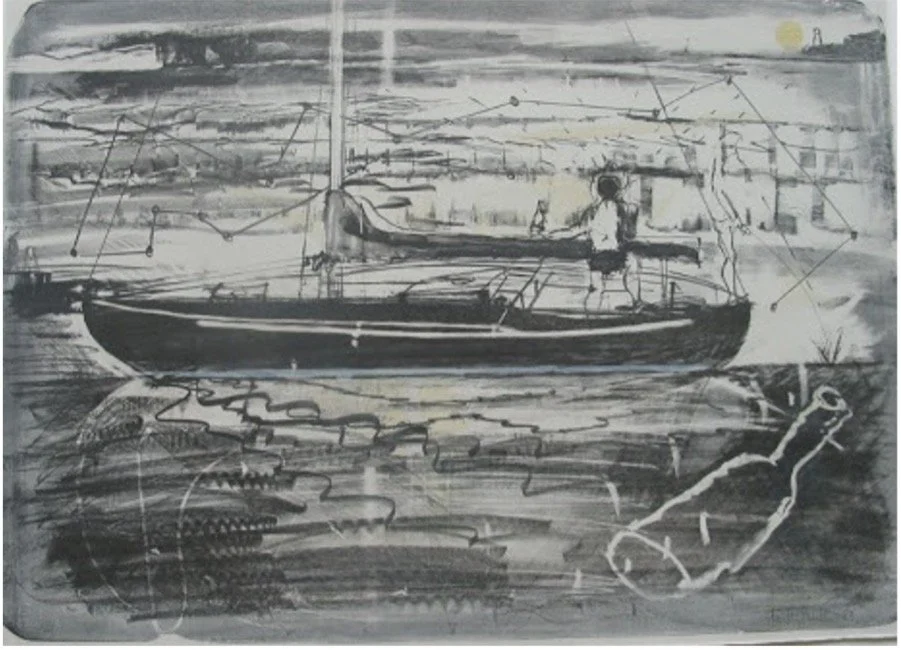 When John Ward designed and built his own 36’ yacht INTRINSIC in 1970, he sold JANAWAY and shortly after, artist John Firth-Smith took on the role of custodian. Replacing the original Austin engine with a new Buch. Otherwise, he kept her as original. John mainly sailed single handed and needed a reliable engine particularly while picking up his mooring in Lavender Bay. He also remembers that Jerry Hendry at Careening Cove made a new Oregon boom with all the original fittings. John Firth-Smith used JANAWAY as inspiration in some of his sketches and paintings.