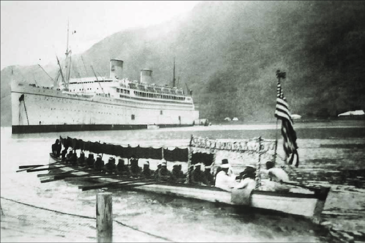 Pago Pago Harbour: Governor O.C. Dowling (Captain, U.S. Navy) departs American Samoa, 15 January 1936, in a ceremonially decorated fautasi manned by 24 Samoan rowers. Source: U.S. National Archives.