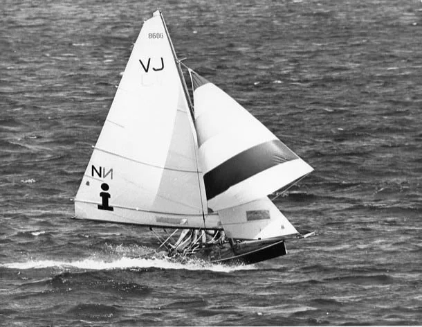 Around this time the father of a fellow VJ sailor offered me a gig forward-handing their VJ on Sydney Harbour for a Woolworths T-Shirt TV spot he was directing. Things were going great until a southerly-buster came in and we capsized again and again and again in amongst the heavy traffic on the harbour. And being only in t-shirts and shorts we froze our arses off. I never did see that ad. We didn’t have a television. But the kids at school saw it so I had my fifteen minutes of fame.