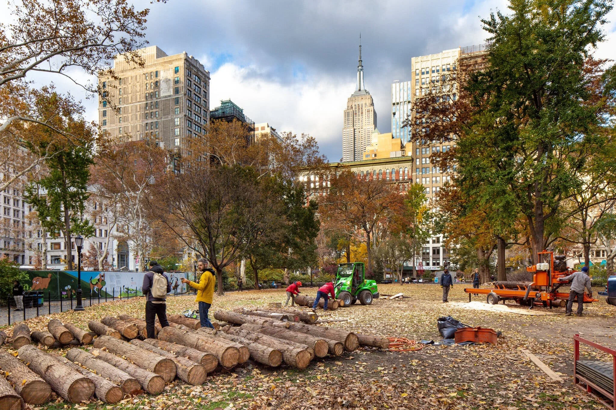 Crews came out on Friday with a mobile sawmill to fell the trees. The teenagers from the Rocking the Boat program were able to witness this step.Credit...Madison Square Park Conservancy
