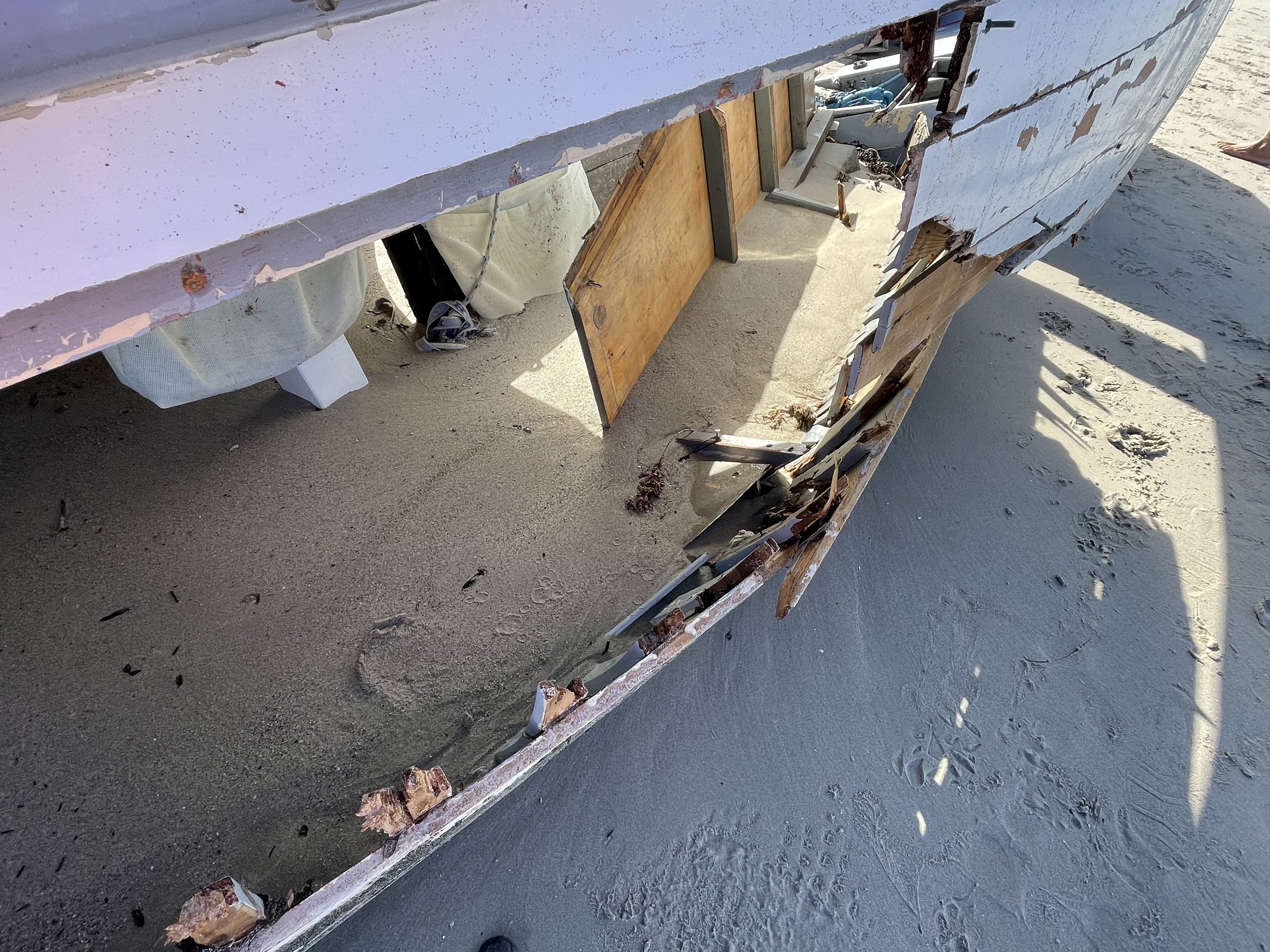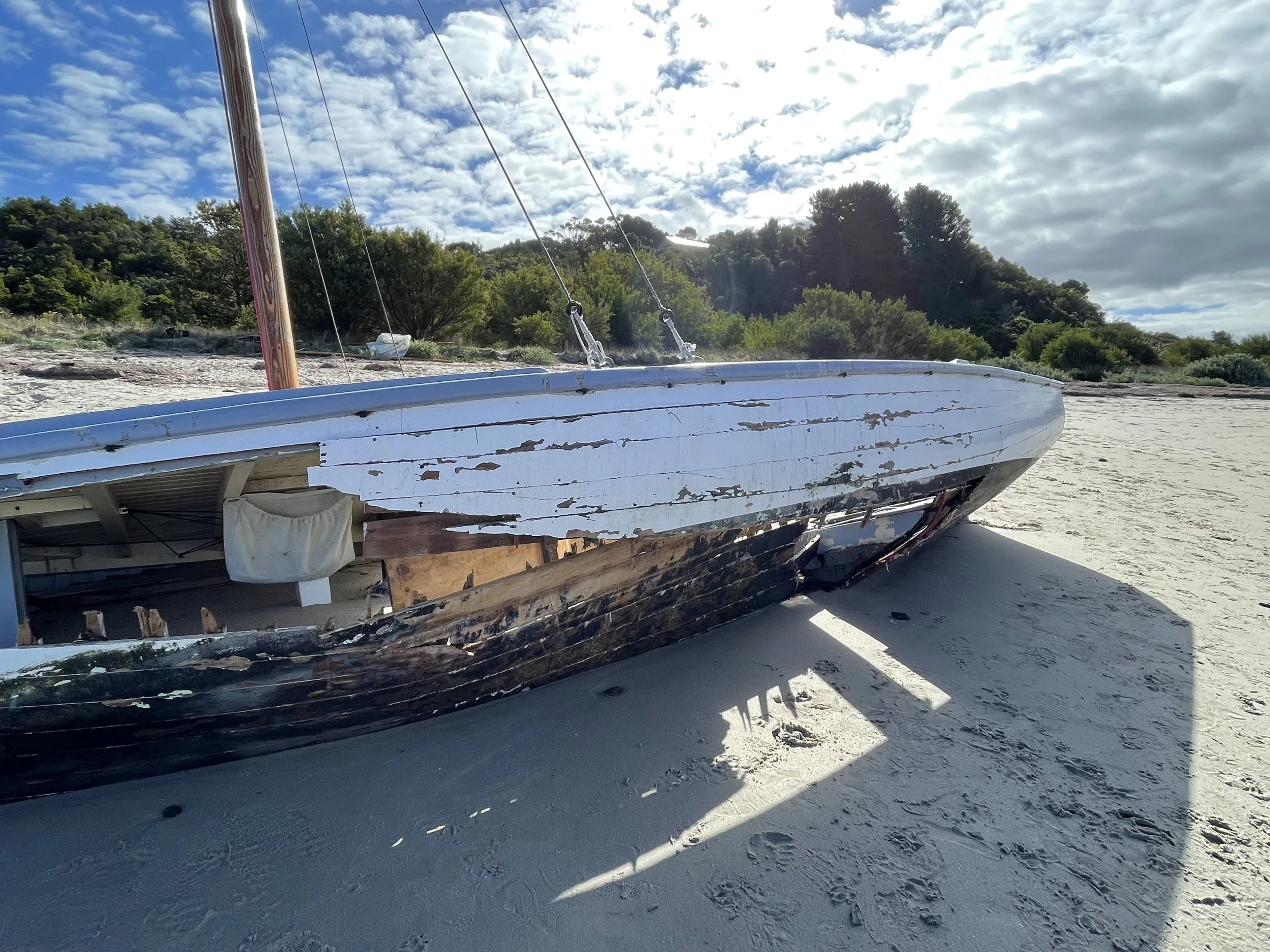 Apparently, the owner spent many hours last week fixing rigging and then took her out for a sail with his daughter. They were seen heading out from their mooring at Flinders and around the point. Tragically, she must have hit the reef and been washed up to where she now sits, broken and filled with sand. The owner must have salvaged the gaff, boom, jib and stashed them on the shore.