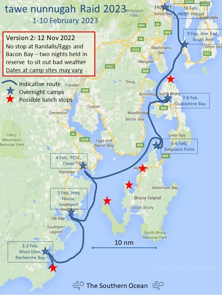 Tawe nunnugah (TN23) is the Tasmanian Raid – a Raid being group voyaging in small boats, usually rowing or sailing and over several days. This particular raid was 10 days timed to finish in Hobart for the Australian Wooden Boat Festival where our 30 or so small craft would be on display, moored alongside hundreds of larger and more spectacular vessels.