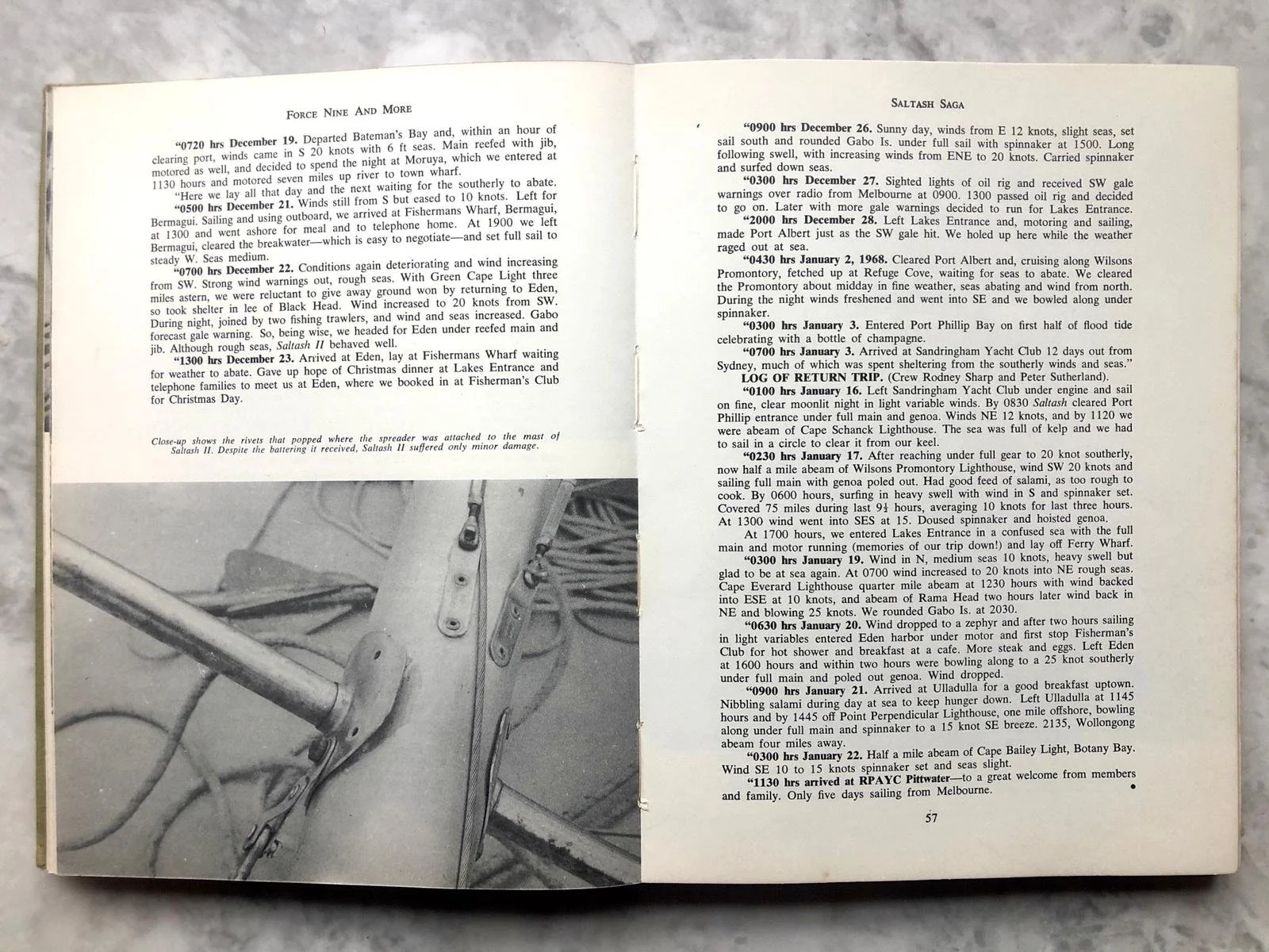 Saltash Saga doesn’t give much inventory of safety equipment beyond a canvas dodger. The log reveals a fast and seaworthy boat skippered by her builder Harold Vaughn who was the President of the Australian Diamond Association. He had an obligation to show up to the national championship and did so in a spectacular way. He and the crew showed courage and stamina, sailing long legs, eating modest often uncooked rations to keep the boat set in 20+ knots. The last leg from Port Phillip heads to Sandringham was completed in four hours. Here’s the story. (click on images to enlarge)