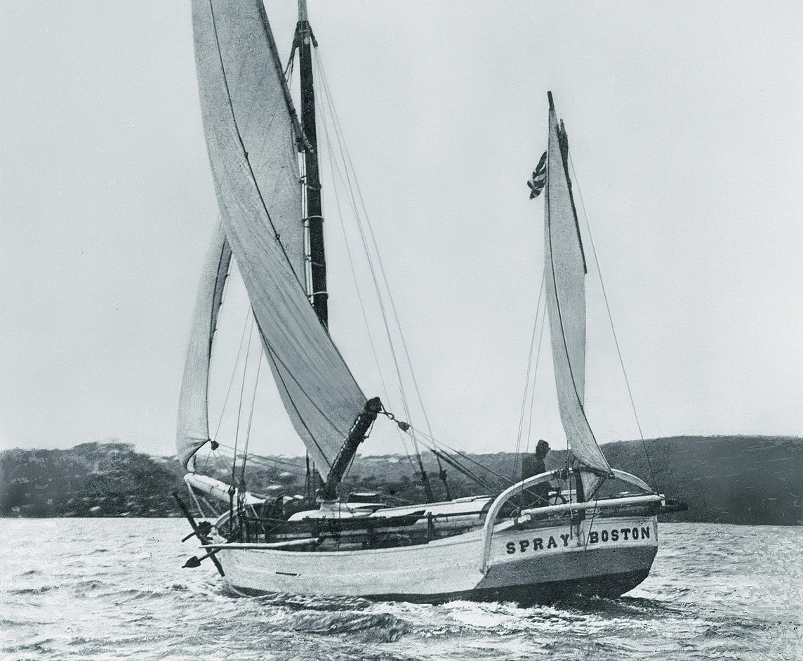 Joshua Slocum’s SPRAY sails near Sydney, Australia, where Slocum was given much-needed new sails during his pioneering solo circumnavigation. Throughout his sailing career, Slocum experienced many fortuitous events and near misses, and came to acknowledge his good fortune as “Slocum’s luck.”