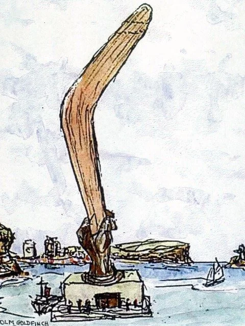A sketch of the 12-storey boomerang sculpture proposed for the Sow and Pigs Reef. State Library of NSW