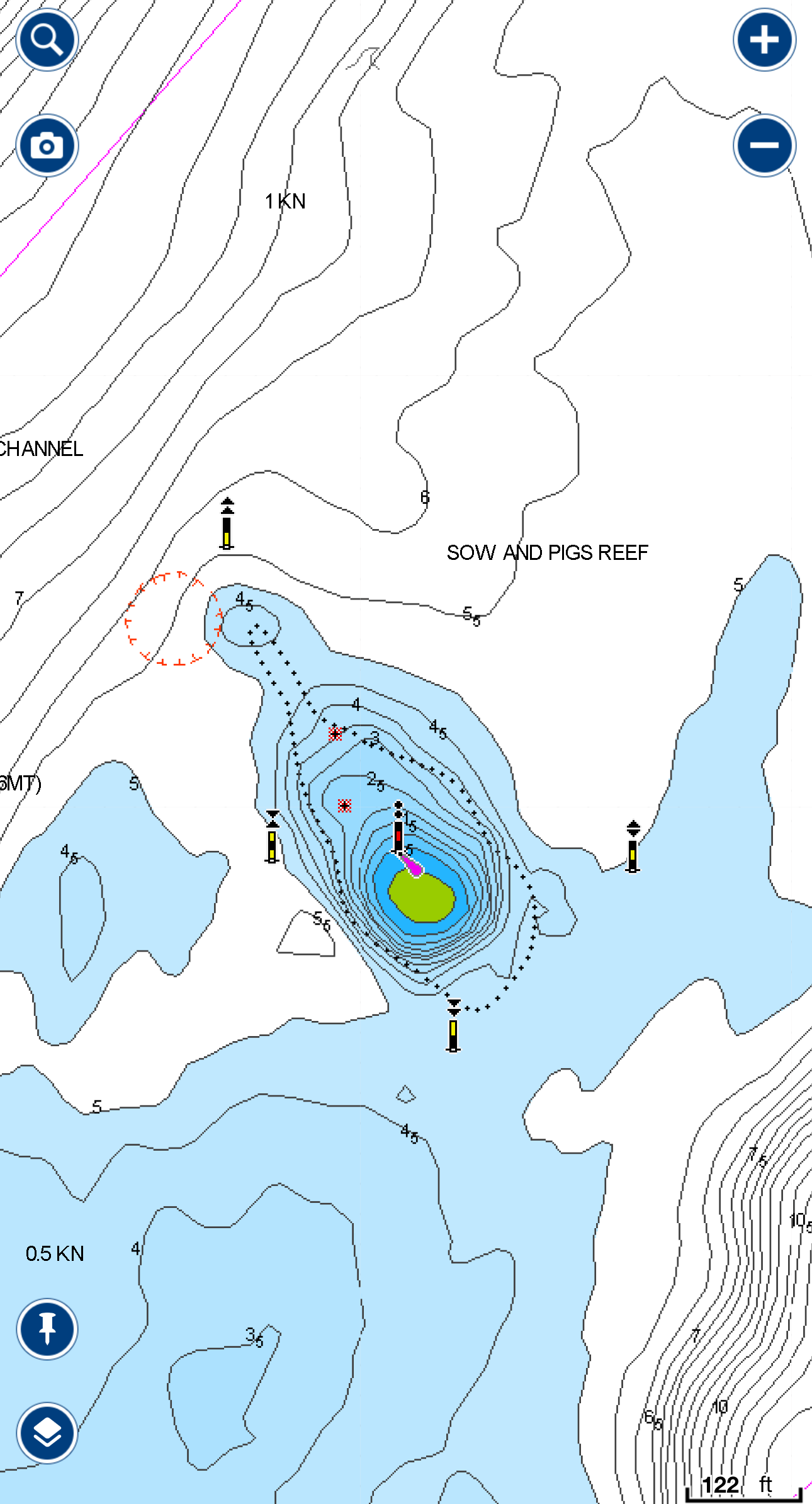 Today the Sow and Pigs Reef is well-known and well-marked, presenting almost no danger to large ships but smaller vessels still come to grief on it.