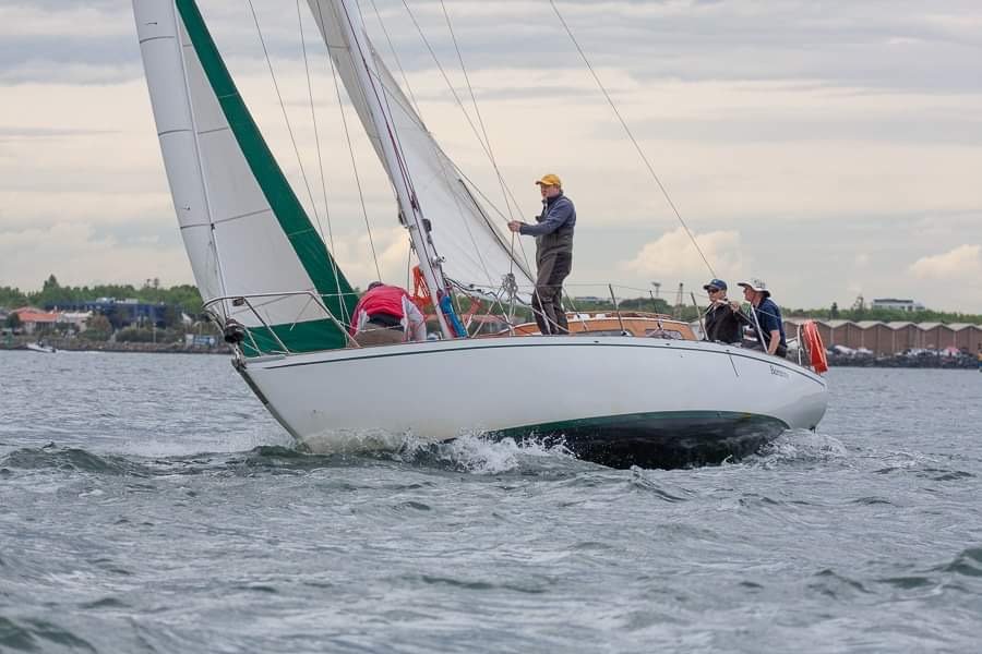 The standout regatta performer was BARANNE in Division 3. Pete Jerabek sailed this little 1965 Sydney Hobart boat to his club on Corio Bay from Kettering Tasmania in 2017. Pete’s an ex YW Diamond sailor so used the lockdowns to restore her and learn to manage and sail a small offshore boat. He sailed up from Geelong on the Friday for the regatta.
