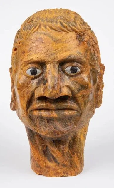 From the Ned Evans collection of the Far North Regional Museum in Kaitaia, - A realistic KAURI GUM CARVING of a Maori chief’s head, with tattooed face and staring eyes. Under Maori custom it was not permitted to make a perfect image of a particular person, so the carver was required to make a flaw — in this case a distorted ear which hardly showed.