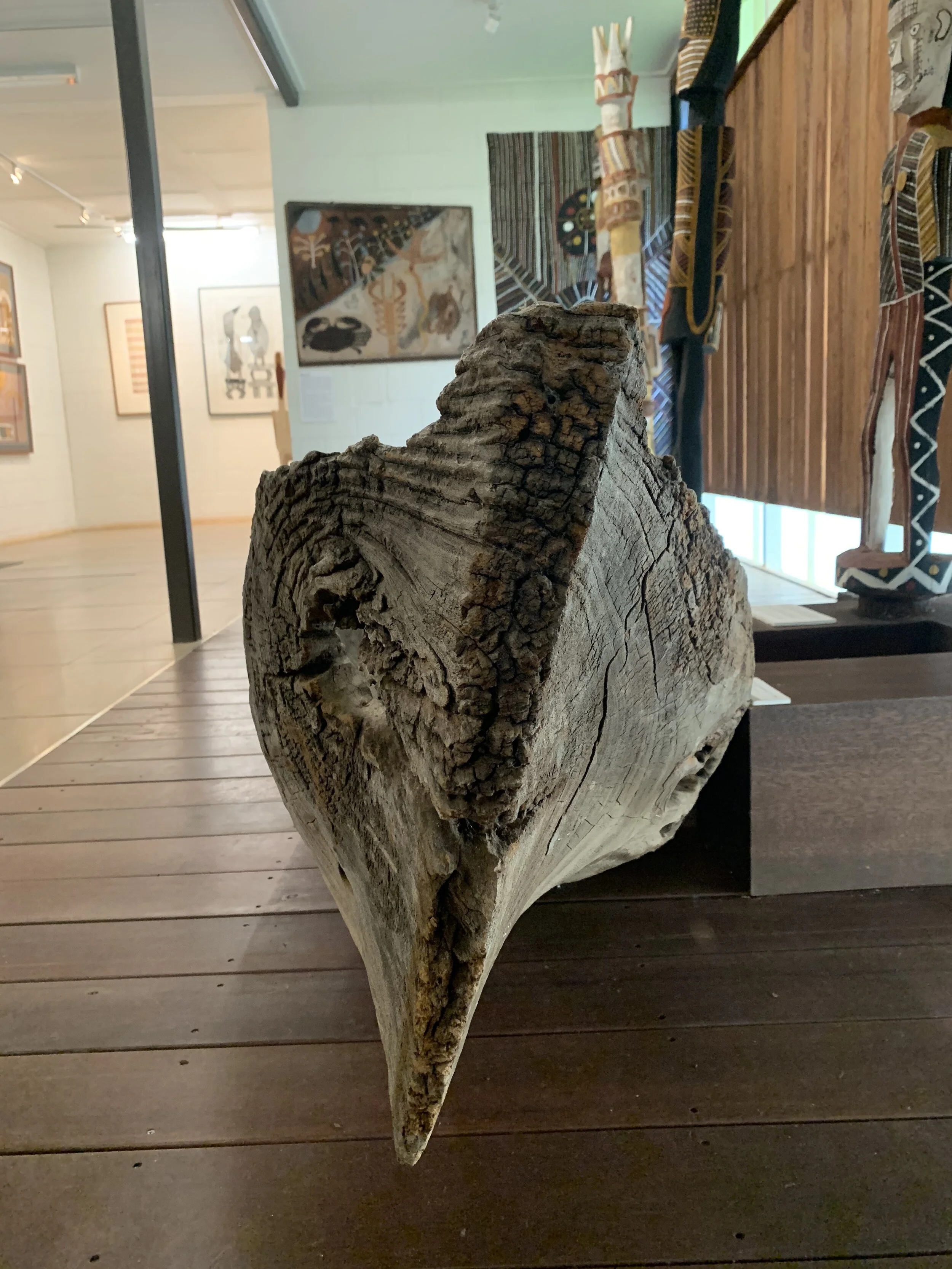 On the day we went hunting in the mangroves, John didn’t come out with us. Gathering periwinkles and mud mussels is woman’s work. But once, having survived the crocodiles and we returned from the beach, John wanted to take me to the Museum. Because there, recently discovered, lay a boat, cut out of a single log, a true dug-out canoe believed to be the oldest craft of its kind in the Northern Territory.