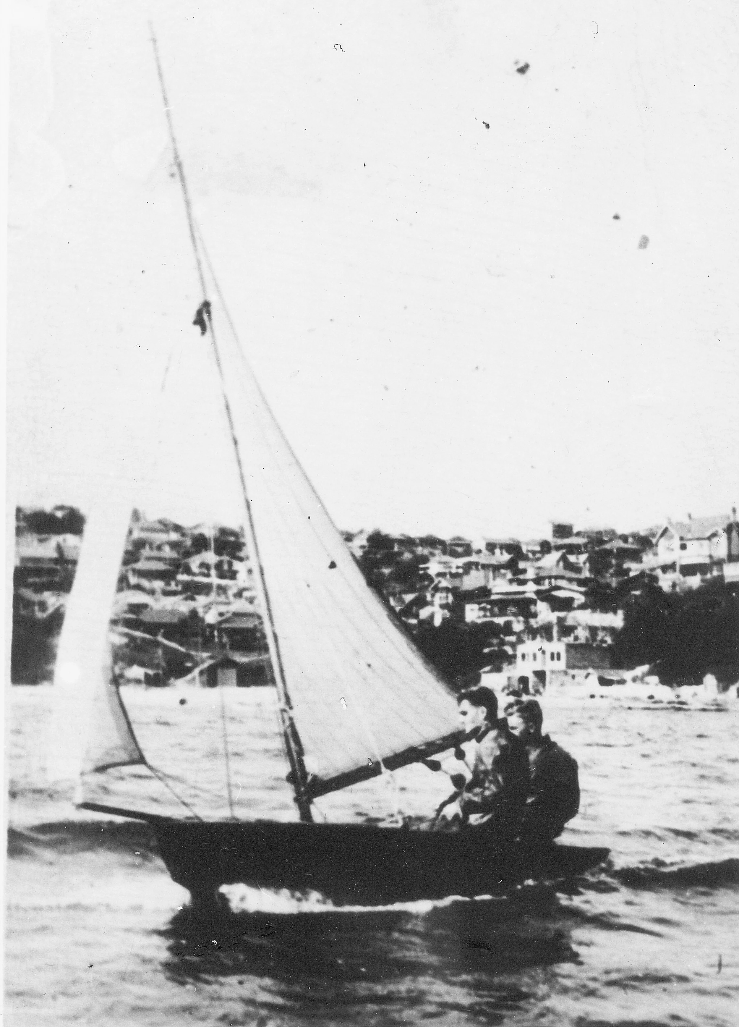 Charles Sparrow at the helm with brother Tom crewing, sailing the second VJ built, ‘Chum’ on Sydney Harbour at Vaucluse 1932