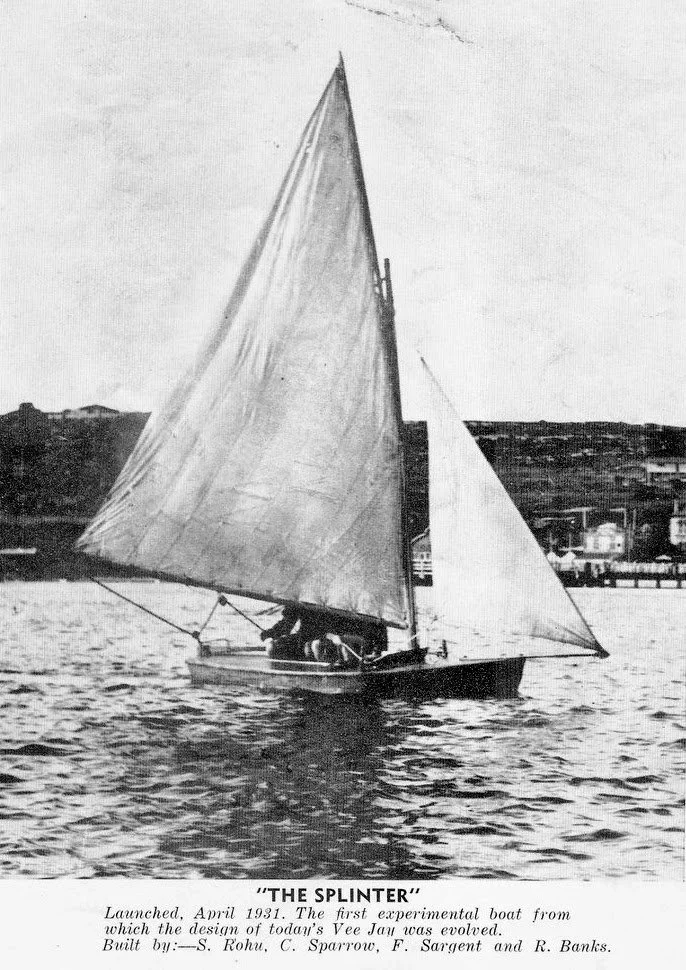 The first VJ prototype called ‘Splinter’ was built in the clubhouse of the Vaucluse 12 ft Amateur Sailing Club by members Sil Rohu, Charles Sparrow, Frank Sargent and R. Banks and was launched on 1st May 1931. It proved to be a little ‘tippy and unstable’ as Charles told me. He then widening the chines by one inch either side to arrive at the final design.