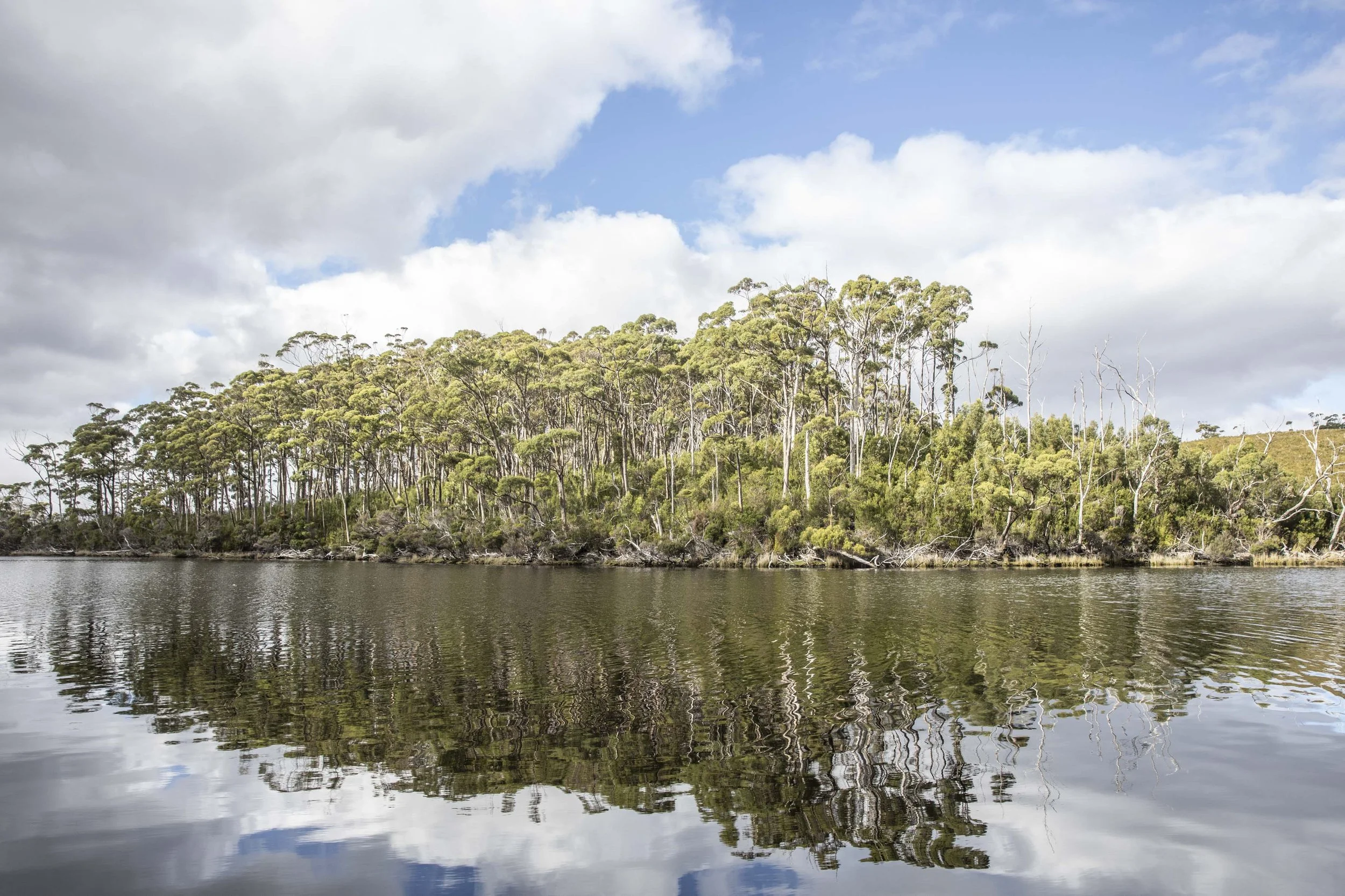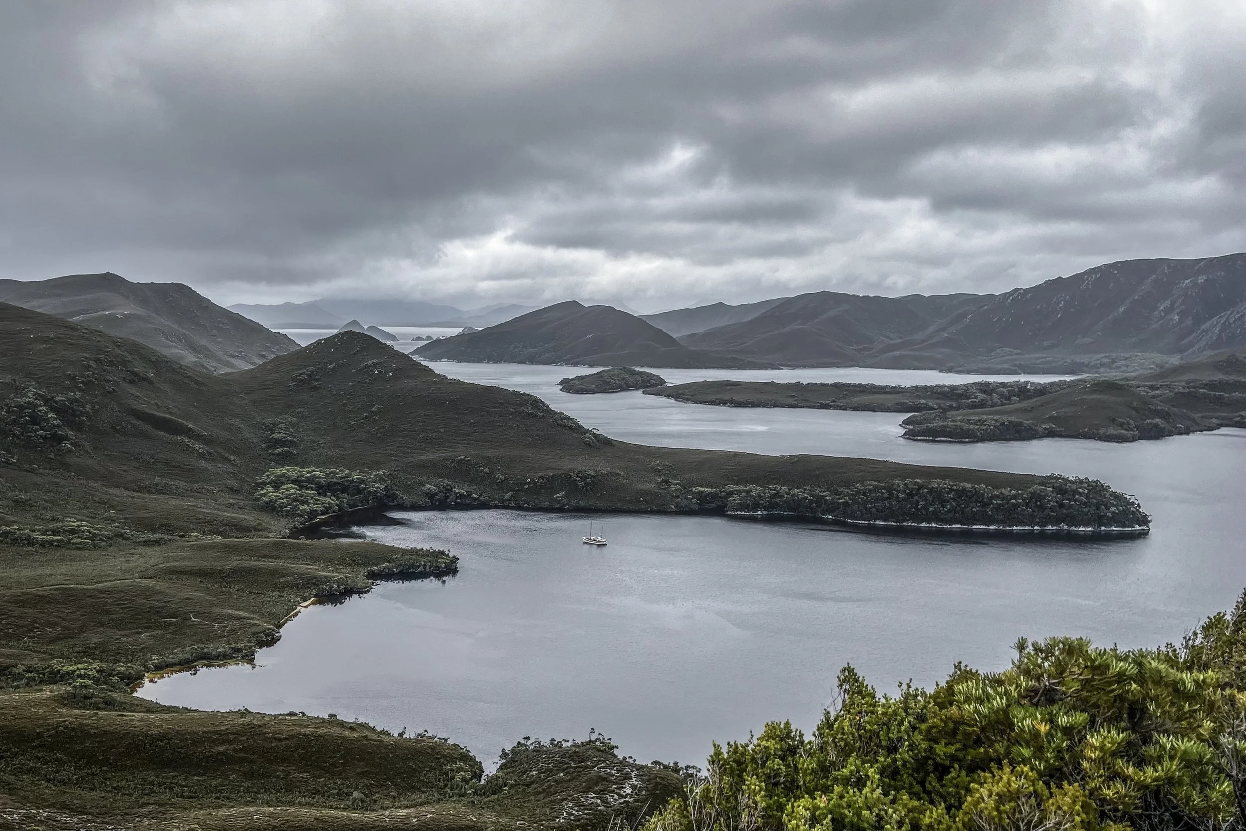 Looking North West across Schooner Cove, Port Davey, JANE KERR in the foreground
