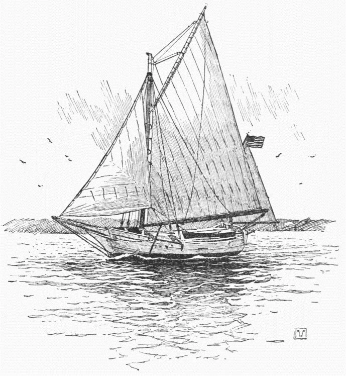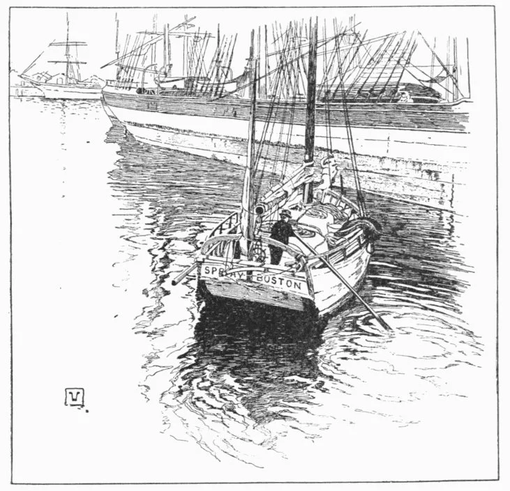The SPRAY leaving Sydney, Australia, in the new suit of sails given by Commodore Foy of Australia. Slocum alone onboard.