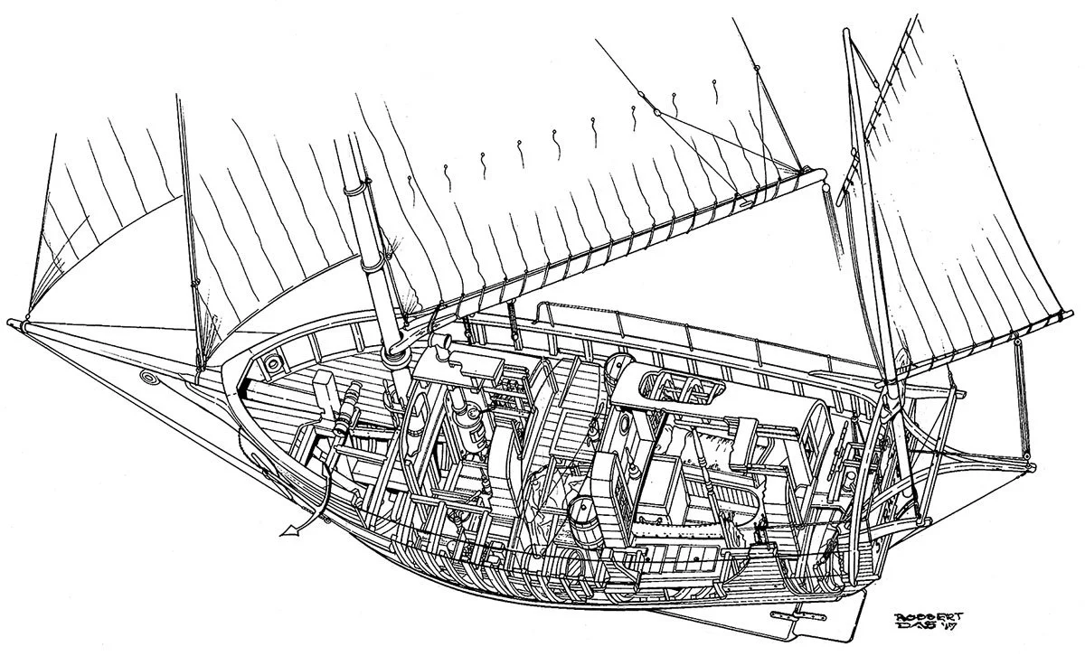 A cutaway illustration of SPRAY shows the boat as imagined by Dutch artist Robbert Das