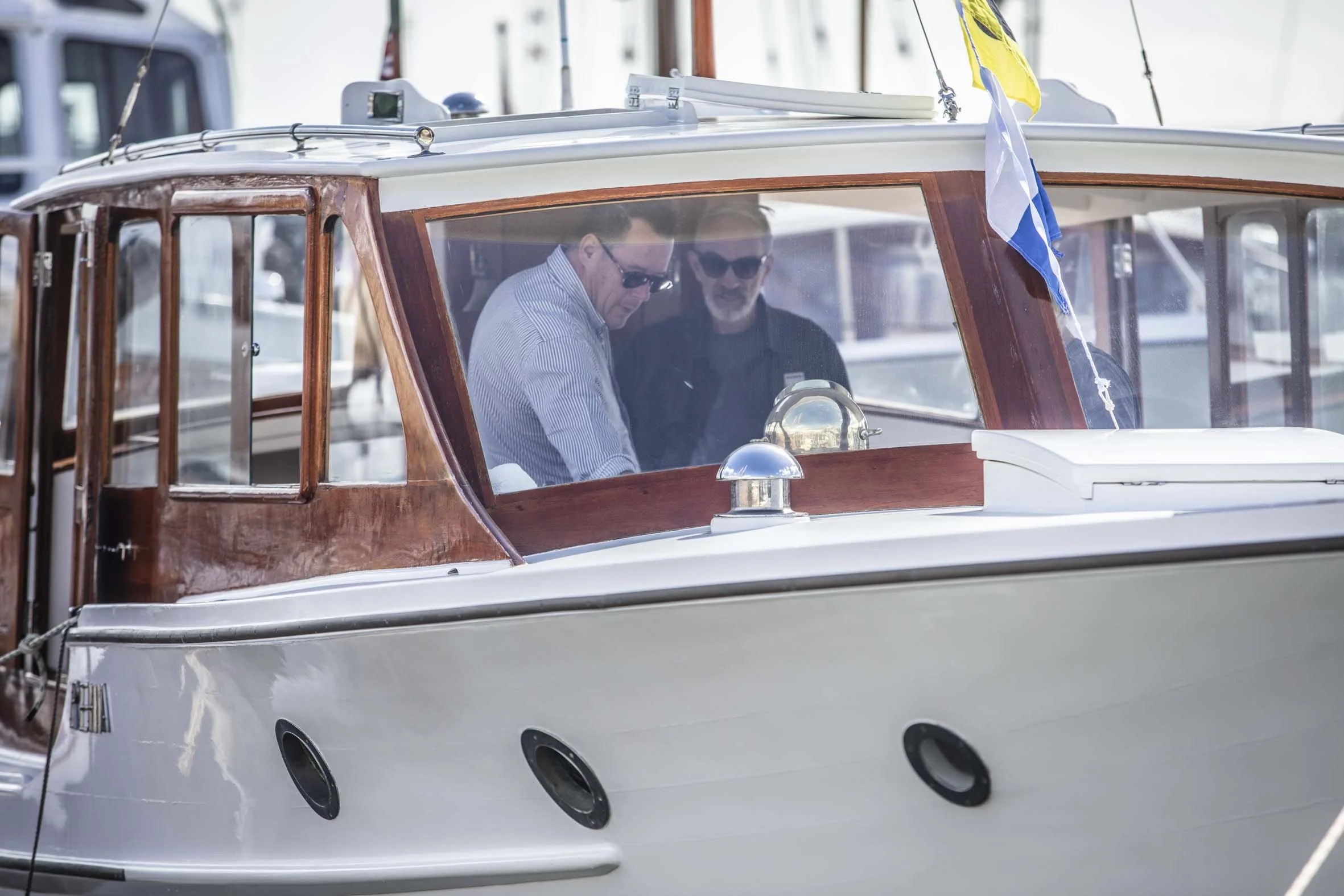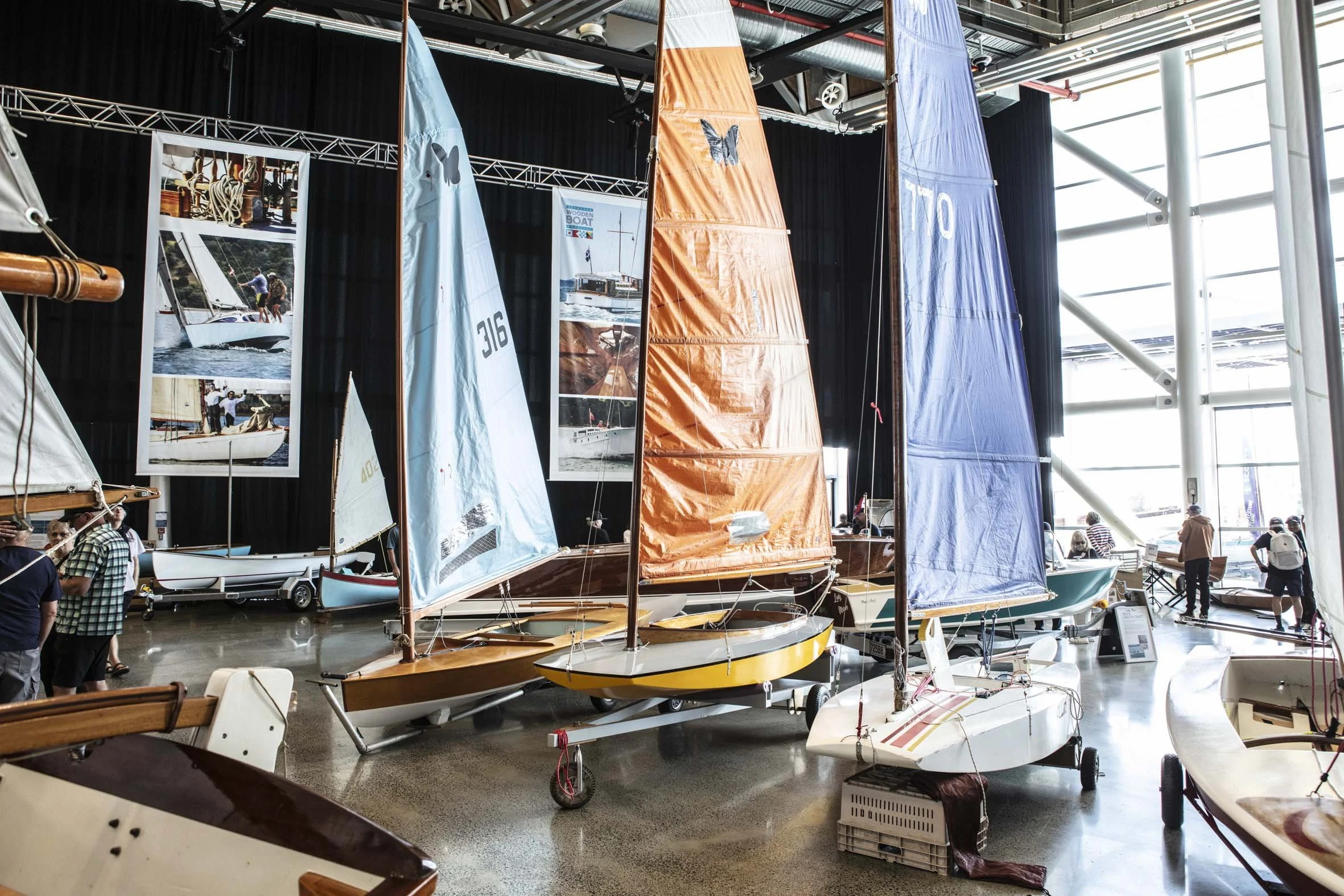 It’s outside the Events Centre that the Australian connection was based. The Australian Wooden Boat Festival had sent a container over from Hobart filled with artefacts and stories from the Tasmanian Wooden Boat world. And perhaps more importantly it was accompanied by Paul Stephanus, the director of the AWBF and a strong contingent of supporters and shipwrights who were more than ready to tell the story of the big sister festival across the ditch. And it wasn’t just the Tasmanians waving the flag with six stars. Spotted amongst the crowds were the Commodore of the Royal Yacht Club of Victoria, Damian Purcell, Australia’s most successful wooden boat builders, Tim and Sally Phillips, Larry Eastwood of “Restoring PETREL” fame, Ian Johnston, maritime author and one of the founders of the AWBF and Philip Brown custodian of ANITRA V and driving force behind so much Classic Yacht activity on Sydney Harbour.