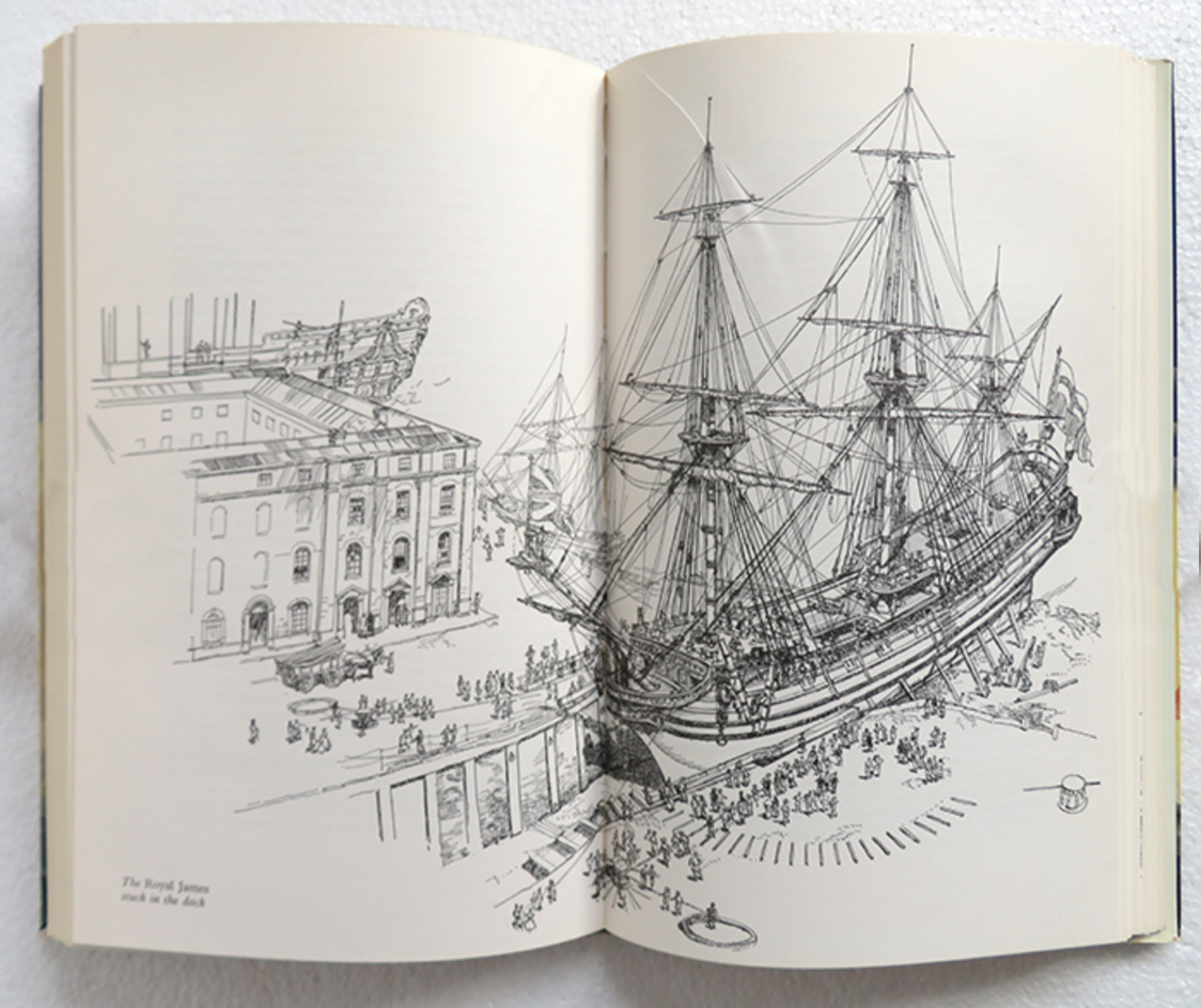 Wilcox also wrote and illustrated several books, most notably Mr Pepys’s Navy, a lively, visually dense account of the seventeenth-century fleet seen through Samuel Pepys’s eyes. It plays directly to his strengths: rigging, hulls, dockyards, half-models, the clutter and choreography of working wooden ships. The drawings are meticulous without being dry - informed by research, but clearly made by someone who enjoyed the subject rather than merely documenting it.