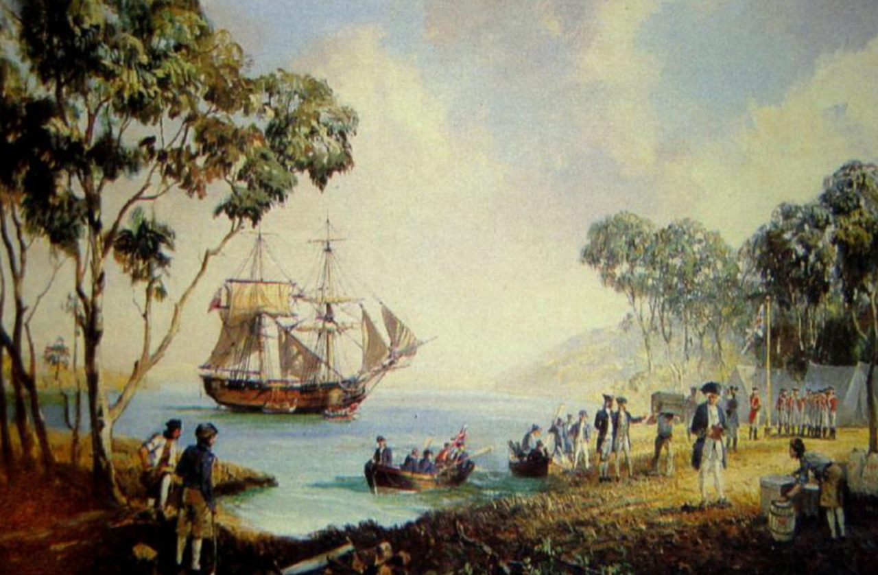 L A Wilcox paintings and prints appear in the Australian Art Sales Digest - including a rather cheesy rendering of Sydney Cove, 26 January 1788 - showing Captain Arthur Phillip raising the flag and declaring “Me hearties...this is the finest harbour in the world, in which a thousand ship of the line may ride in the most perfect security… and mark my words…future generations will commemorate this day with a nationwide piss-up”.