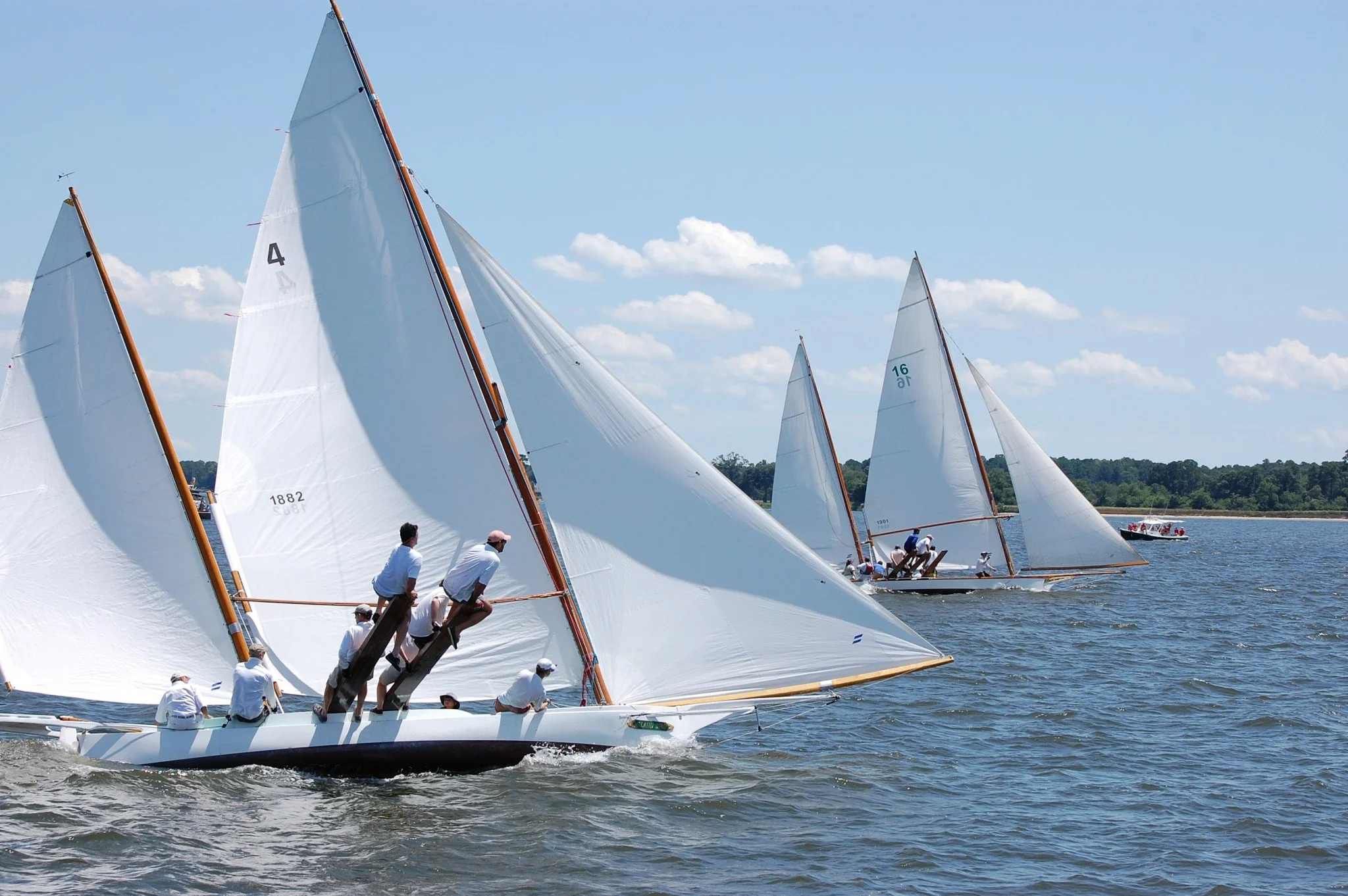 The Chesapeake Bay log canoe — which eventually developed the famous "springboard" hiking plank — traces directly back to Native American dugouts. Native Americans along the bay used dugouts to spear fish, gather oysters, and travel. Europeans adopted the log-canoe technology shortly after arriving in the region in the early 1600s, and by the start of the 18th century had modified the standard single-log dugout by hewing and shaping several logs to enlarge the craft, adding masts and sails. The first recorded log canoe regatta took place in 1859 near St. Michaels. As racing intensified, crews instinctively placed themselves outboard for leverage, and the springboard was formalised as a detachable plank. In order to keep them upright when switching direction, crews perch on the movable wooden planks to provide human ballast.